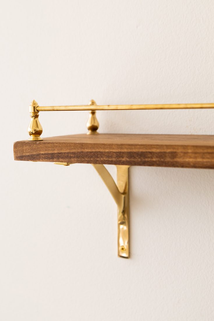 Learn how to make this beautiful DIY Brass Rail Gallery Shelf using a piece of pre cut wood from the hardware store.