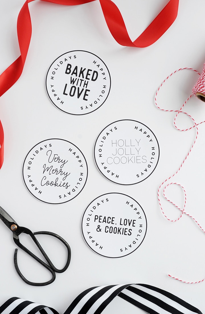 We love to wrap thick striped ribbon around our TakeAlongs® and then top it with our Free Printable Cookie Label. We created four different versions for you: Baked with Love, Very Merry Cookies, Holly Jolly Cookies, Peace, Love & Cookies. Just print the Free Printable Cookie Label sheet out, cut them out and have them ready for your package. These black and white modern labels go so well with the red topped TakeAlongs®. And please remember, the labels are for personal use only.