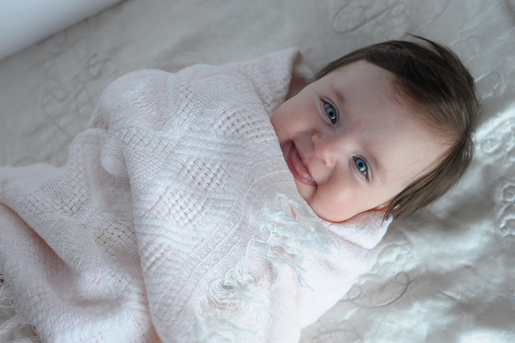 Sara and I took these photos of Poppy (four months old) with the blankets this past week in San Francisco. As you can see, she felt the love… as big smiles were on her face the whole time she was wrapped up in these family blankets.