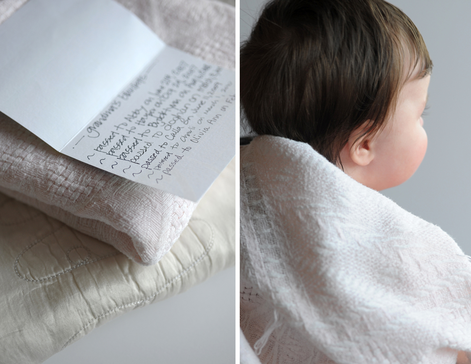 After our grandmother Lois passed away, our mom and her siblings meticulously cleaned out our grandparents’ farmhouse in southwestern Minnesota. Folded neatly in the back of a closet were these two baby blankets. How perfect, thought our aunts, to start a new family tradition. The blankets would go to all of the great granddaughters. Each baby girl would get to be wrapped up in these heirlooms our grandmother had saved. When the next girl was born, the blankets would be mailed on to her.