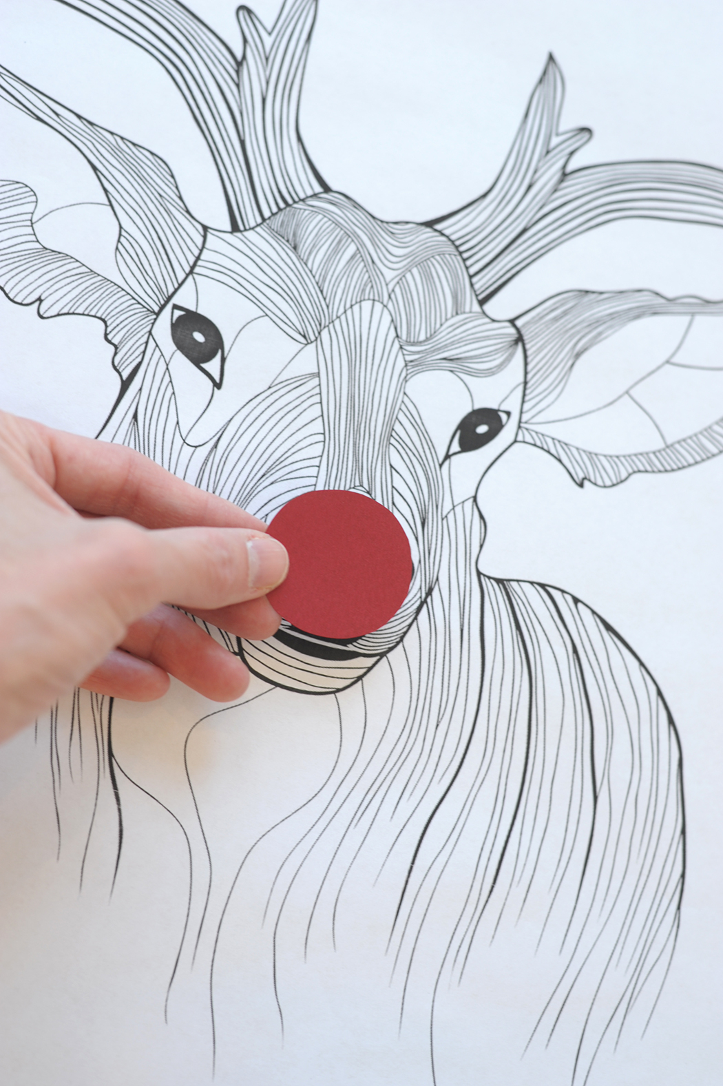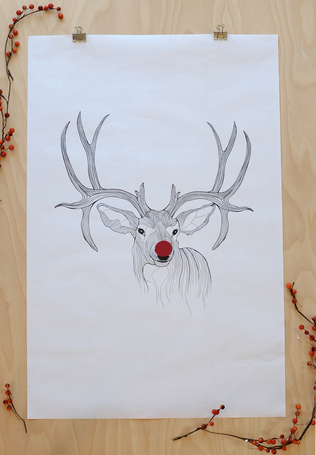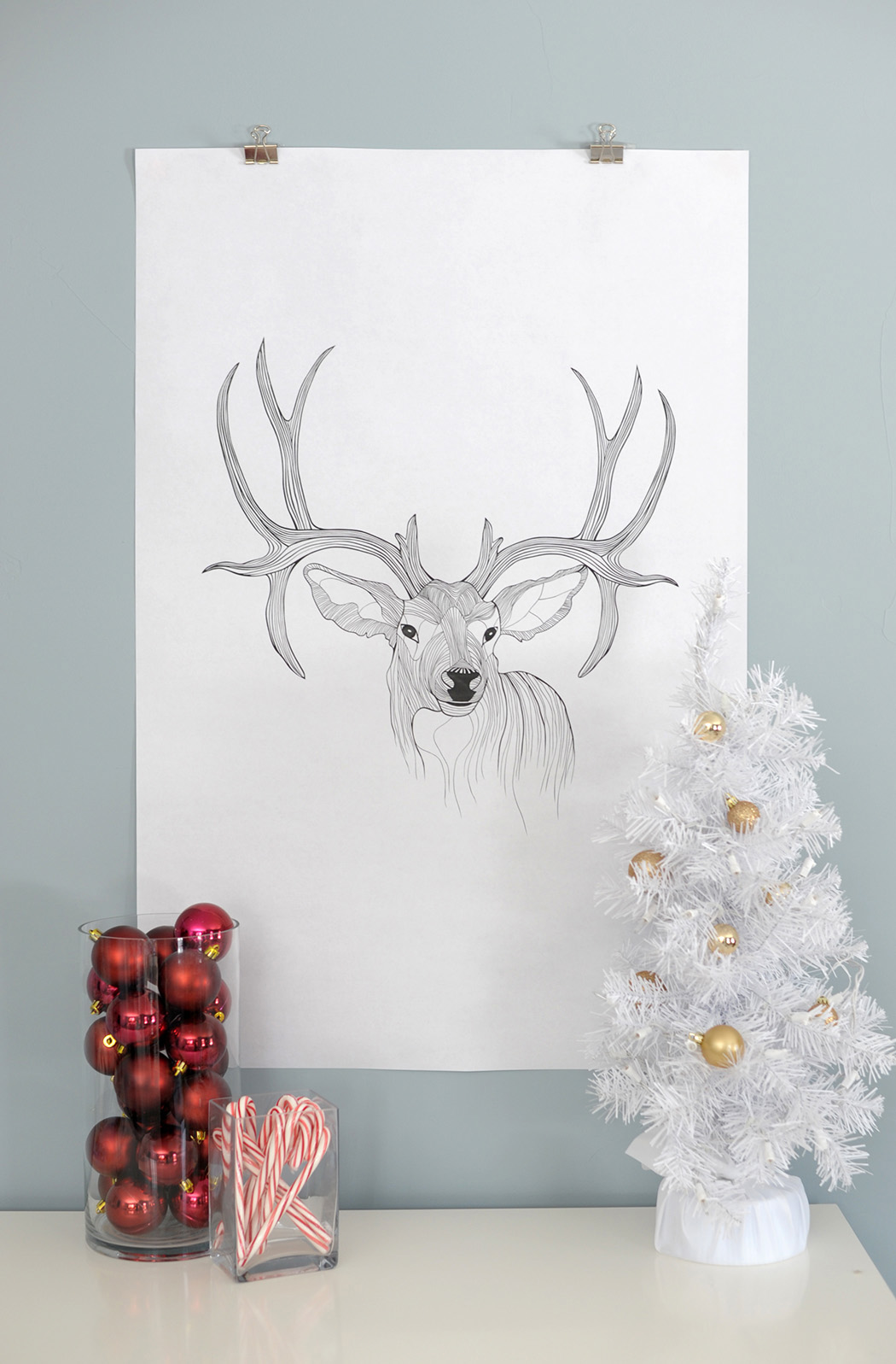 I printed mine out at my local copy shop as a 24×36 engineer print. Just download the printable here: reindeer-free-printable. Remember this is just for personal use. Thanks for following the rules 🙂 And don’t forget to throw on a cute red nose to turn this reindeer into the classic Rudolph.