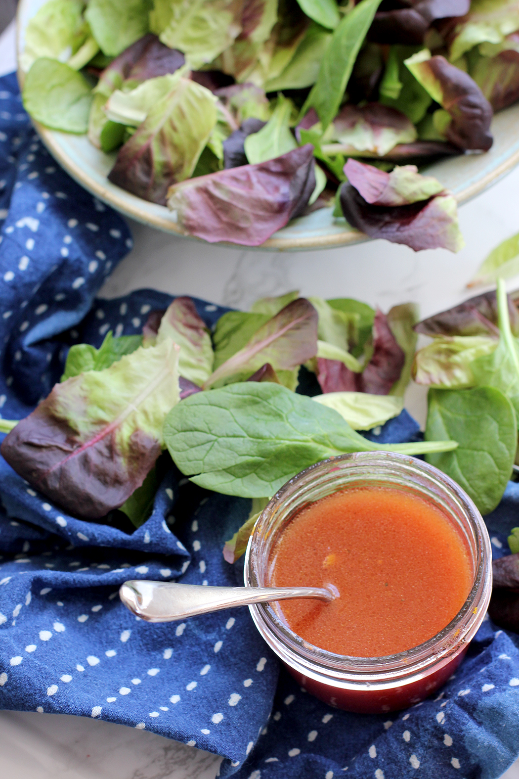 A few things about blood oranges – I think they are so beautiful in color and they are such a unique citrus flavor. I picked up a bag at the market and couldn’t wait to try and add them into a few daily eats. I decided to wipe up a homemade salad dressing to use throughout the week. So tasty! Now, I dreamt of trying to replicate a blood orange dessert we had for our birthday but settled for making a vinaigrette instead.