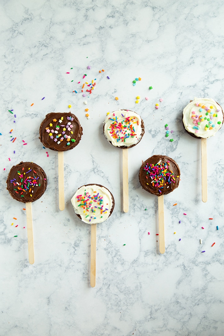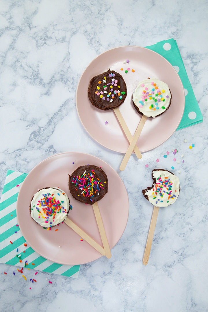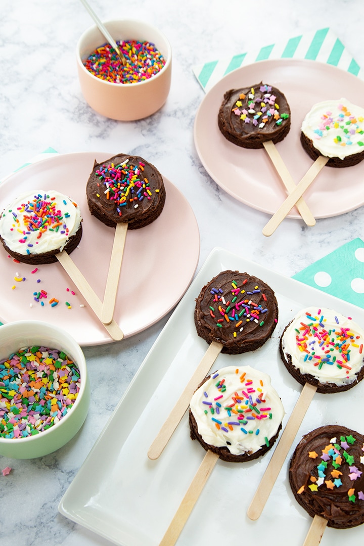 Other fun ideas to use this Brownie Pops recipe is to set up a brownie pop bar at your party or dinner. Set up little bowls of Chocolate Fudge and Vanilla frosting, little knives, sprinkles, little candies and popsicle sticks. The kids can make their own brownie pop during the party.