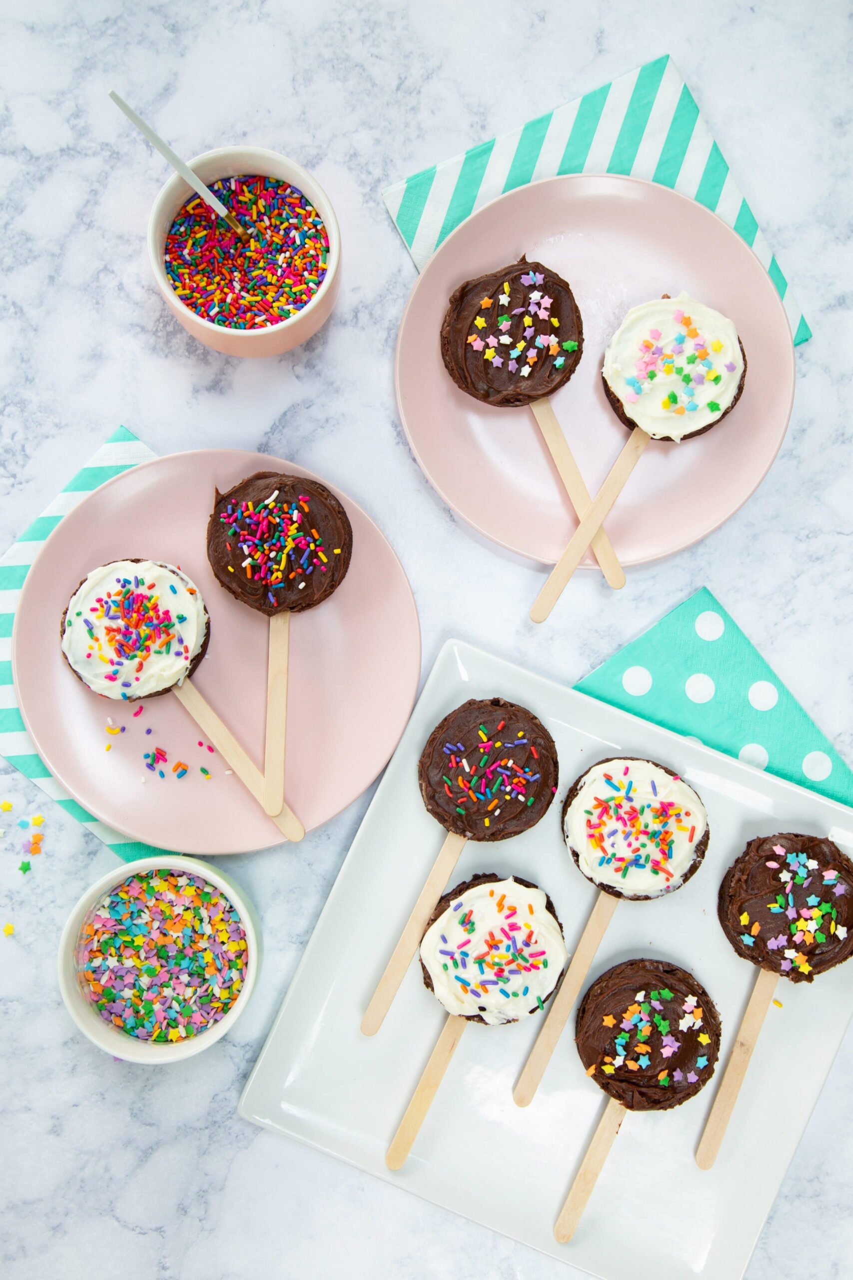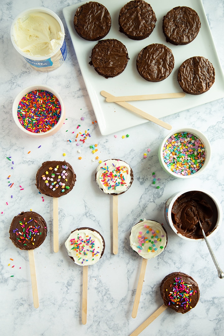 - Spread frosting on each brownie and top with sprinkles. You can even use food coloring to dye the vanilla frosting different colors. The kids love this part!
