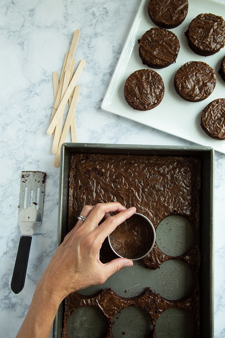 - Using a circle cookie cutter, cut 12 circles. Remove the circles from pan carefully. Place onto a tray. You can keep the scraps of brownies for later (top on ice cream, etc.)