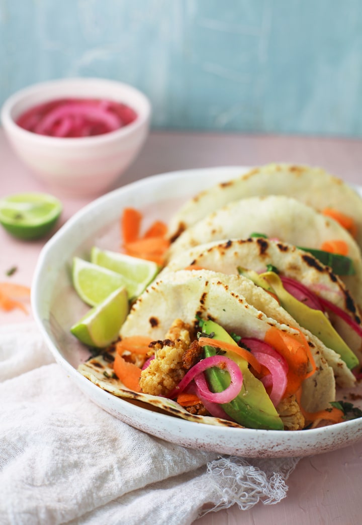 Assembly the tacos. Divide the crispy baked cauliflower between the corn tortillas. Add the sliced avocado, carrot and pickled onion. Top with cilantro and a squeeze of lime juice.
