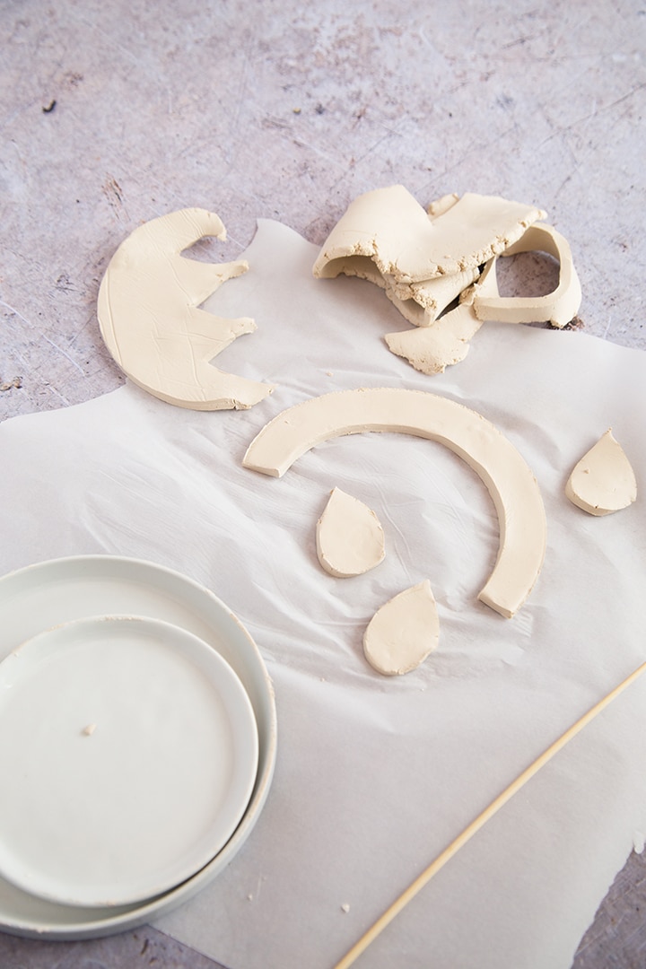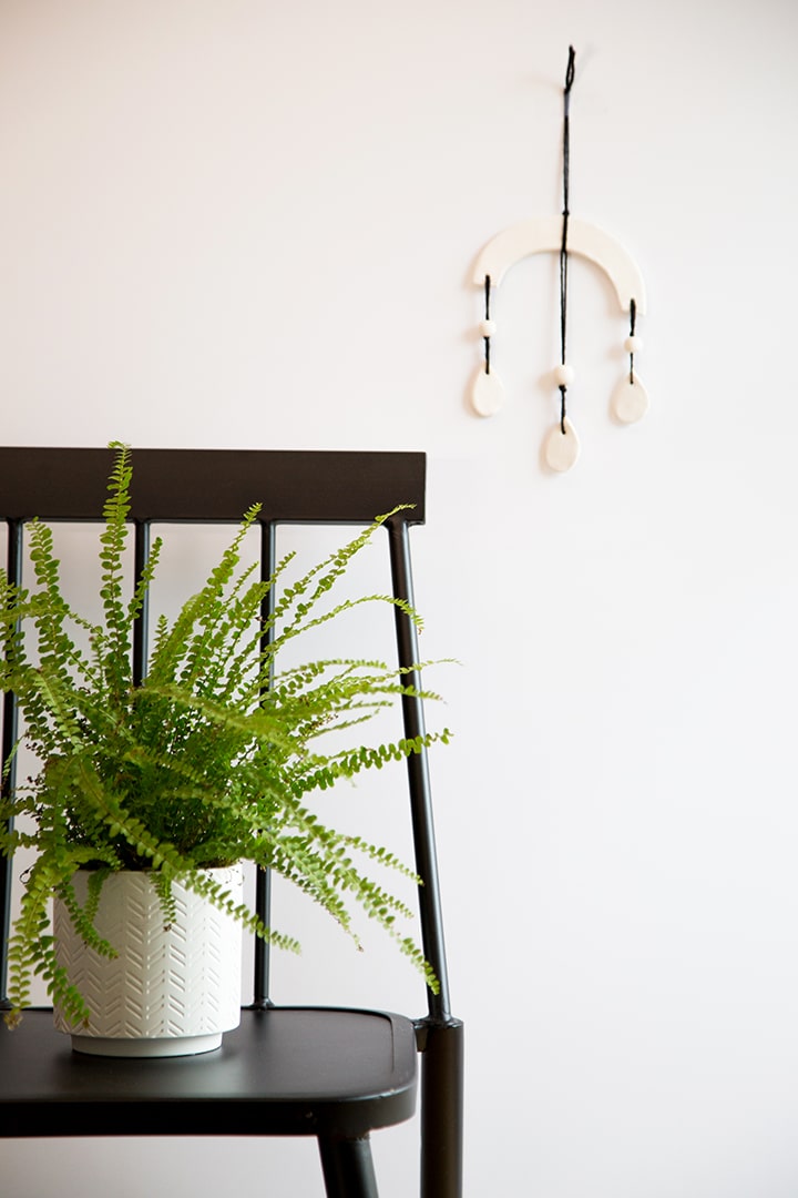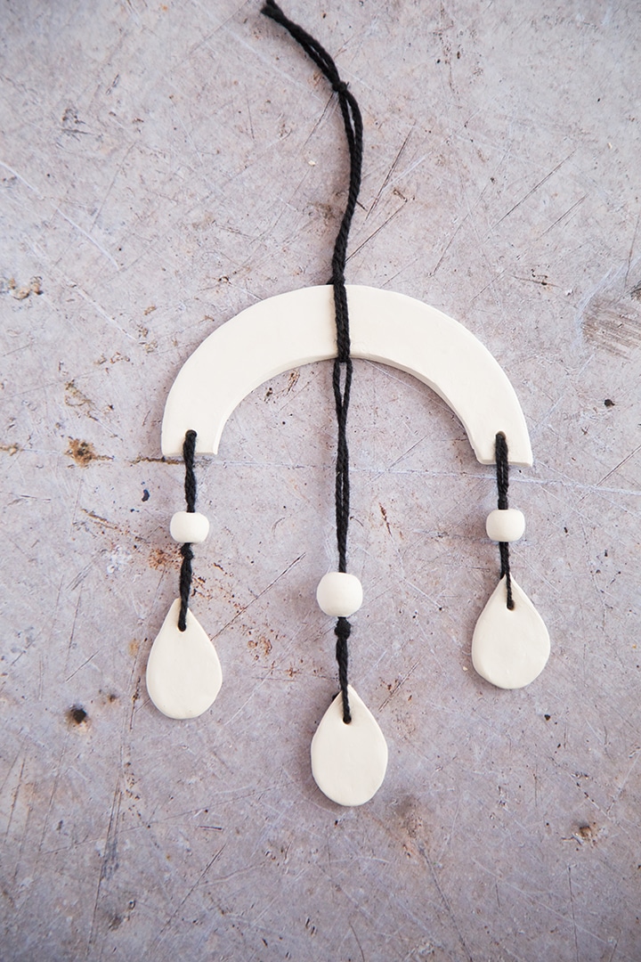 Who doesn’t love a good air dry clay project? We are obsessed with the ease and versatility of using air dry clay in projects. Our fondness for this medium started with Melissa’s little nesting bowls (in 2014). Then we made platters and even made plates and bowls to look like enamel ware. And can’t forget about the clay ornaments! Today I am so excite to share how I made this DIY Air Dry Clay Wall Hanging. I kept the clay white and used black cording to keep it simple. There is something about the white and black that gives it a modern feel. I used plates to make the arched shape. And hand drew the little rain drop shapes. Check out all the details on How we made this our DIY Air Dry Clay Wall Hanging Darby video.