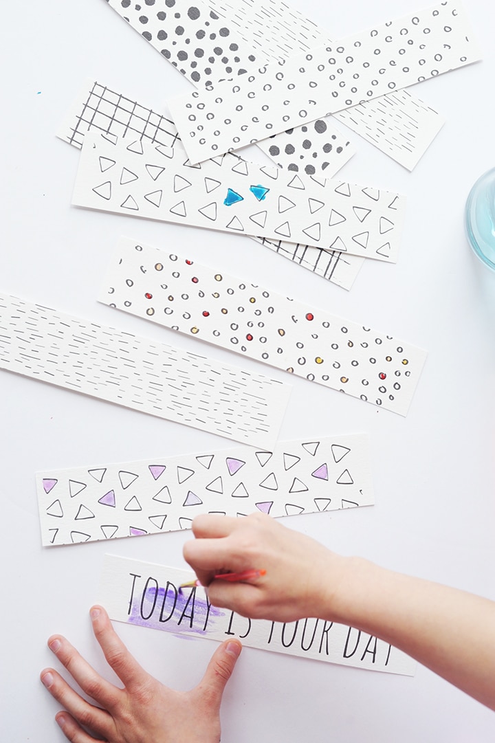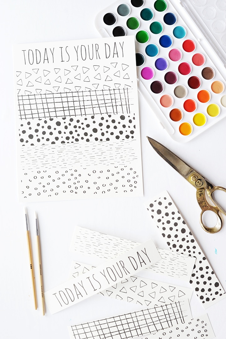 Supplies: DIY Birthday Countdown Paper Chain Printable, white card stock or watercolor paper, scrapbook paper or construction paper, scissors, tape, watercolors and brushes