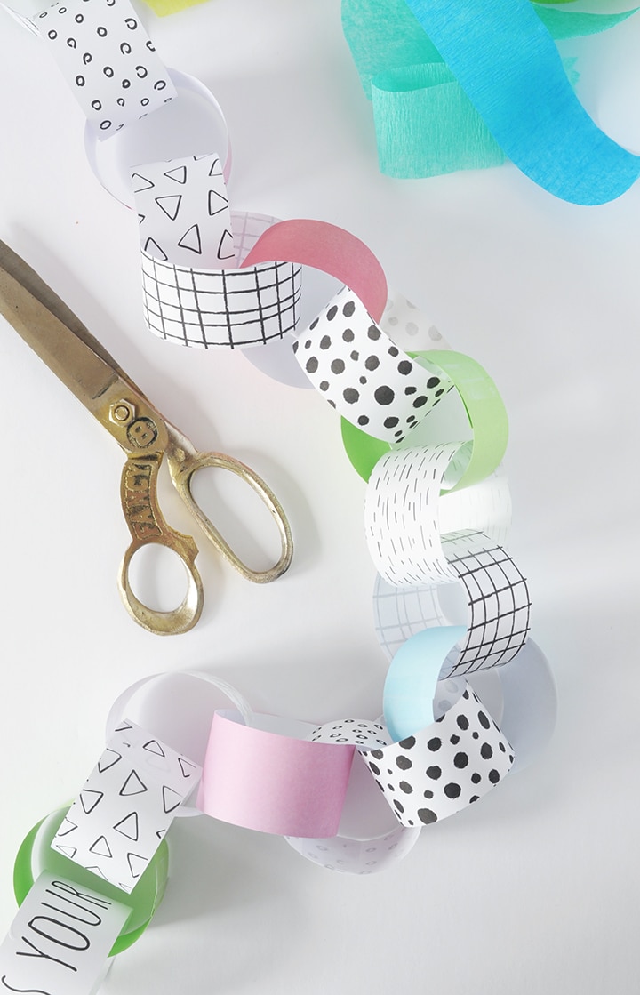 I created this fun black and white DIY Birthday Countdown Paper Chain Printable for you guys. All you have to do is download one file, print out some copies and cut and tape away. We even printed some on watercolor paper and let the girls paint the links. And here’s another one of our favorite birthday celebration DIY projects, our birthday candle garland.
