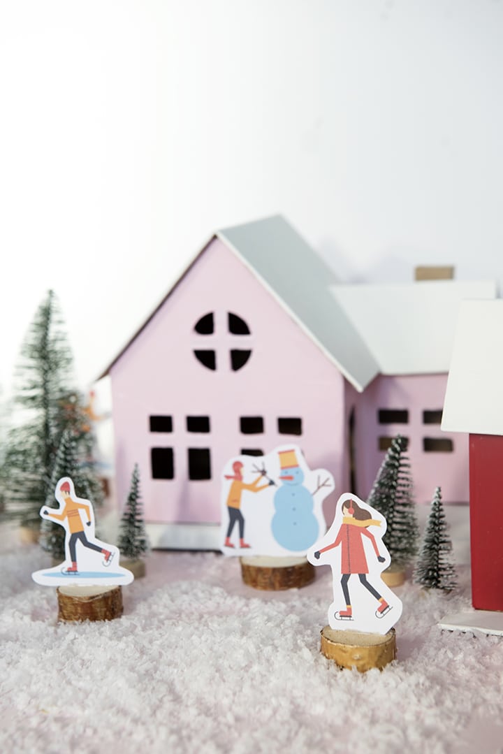 And what’s so fun about this DIY village is that we included some fun free printable holiday figures to add to your village. Skaters, skiers, snowman and more adorn your sweet holiday village.