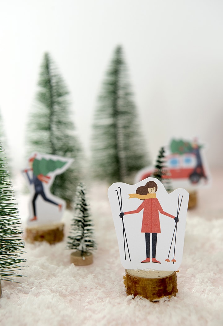 It’s so fun to have these cute holiday figurines to add to the village. And it was so simple to cut them out and hot glue to the adorable little wood discs from Oriental Trading. We love the skiers the most!