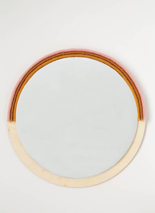 Simple materials for this project include a circle unfinished wood piece, circle mirror, rope and yarn. So simple!