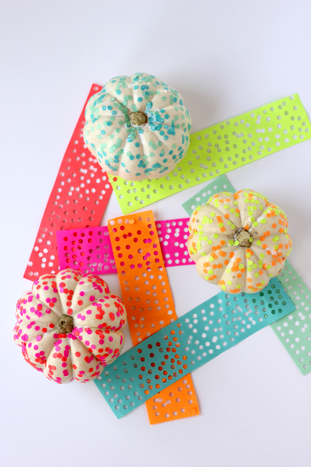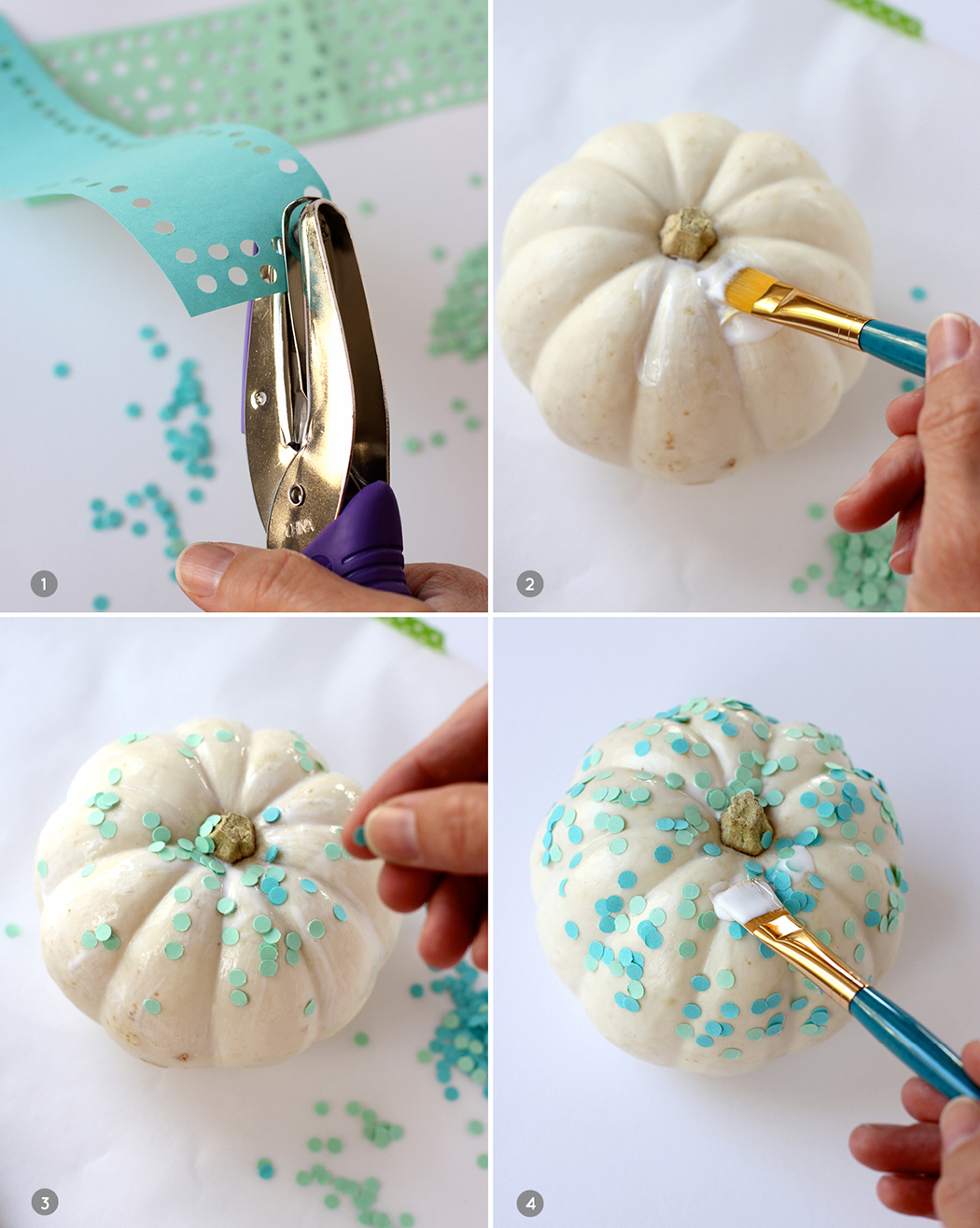 Supplies: white pumpkins // colored paper // hole punch // Mod Podge