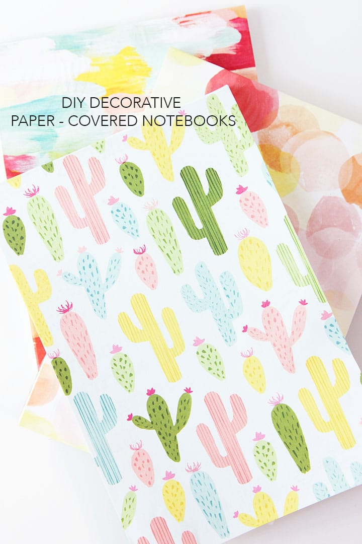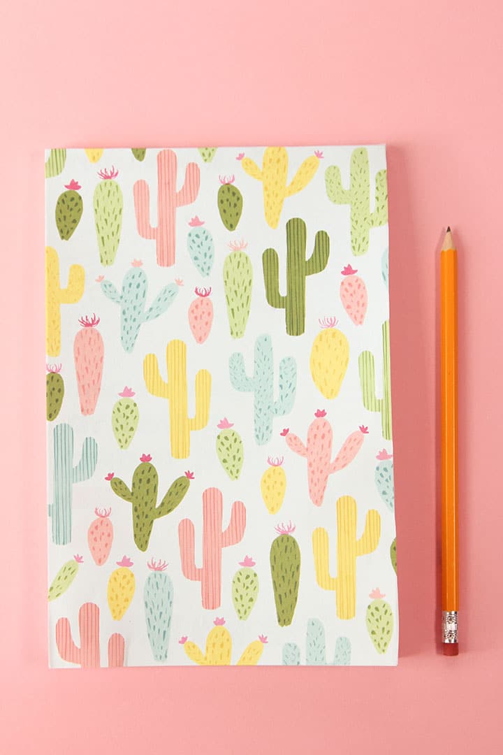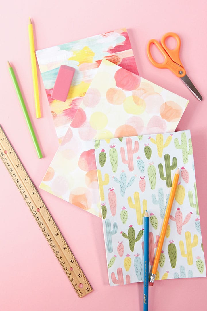I have to admit, I love school supplies as much as my 4th grader. I think that I was just as excited to go school supply shopping as she was… and she was really excited! There is something so satisfying about adding some DIY flare to basic supplies. Whether they are supplies for school or home office. Today I am showing you how to take simple sketch notebooks and turn them into a new favorite journal or notepad. I used brightly colored and patterned scrap book paper to add the pop of color to the otherwise boring notebooks. I mean, isn’t this Cactus Decorative paper darling! You only need a few supplies for this DIY Decorative Paper Covered Notebooks project.
