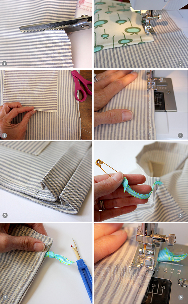 Step 8 – Pull the knotted ends through the opening and sew using a zig zag stitch. Trim the ends of the ribbon and seal.