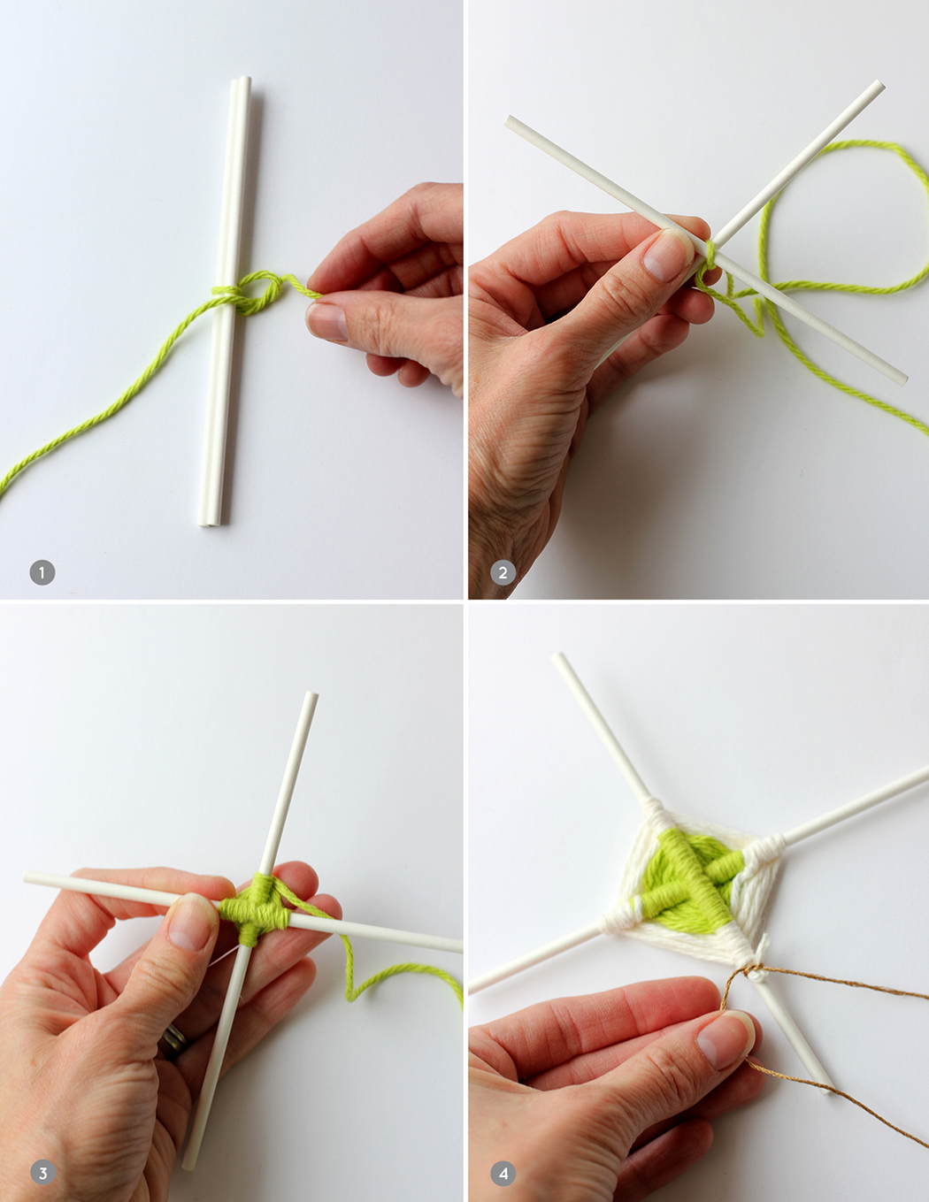 3. Start wrapping the yarn around the sticks – pull the yarn under the stick to the right, looping the yarn up and over the stick. Go to the next stick and do the same, under wrap around stick and go to the next.