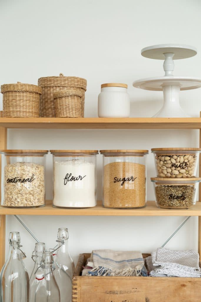 There is something almost therapeutic about showcasing pretty glass bottles, jars, linens and kitchen accessories on open shelving or behind glass cabinets. This look also works on the part of your pantry that might be more visible. I love the look of the glass jars with wood lids when mixing white dishes, glass and natural wood. Such a clean and fresh look to a kitchen.