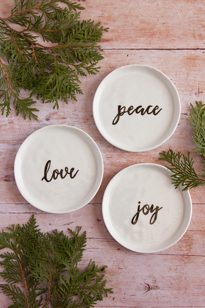 These make such a sweet little gift for a friend. You can write anything you wish on the plates – we chose the words, Joy and Peace and Love. We will gift as the trio. But you can do a New Year’s gift and write 2018 or Cheers. The possibilities are endless.