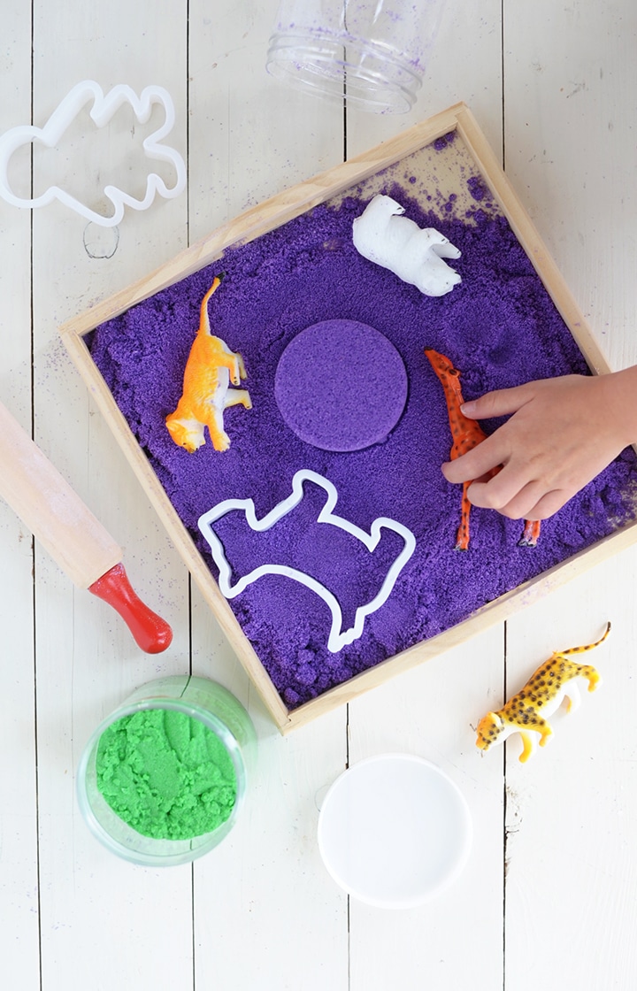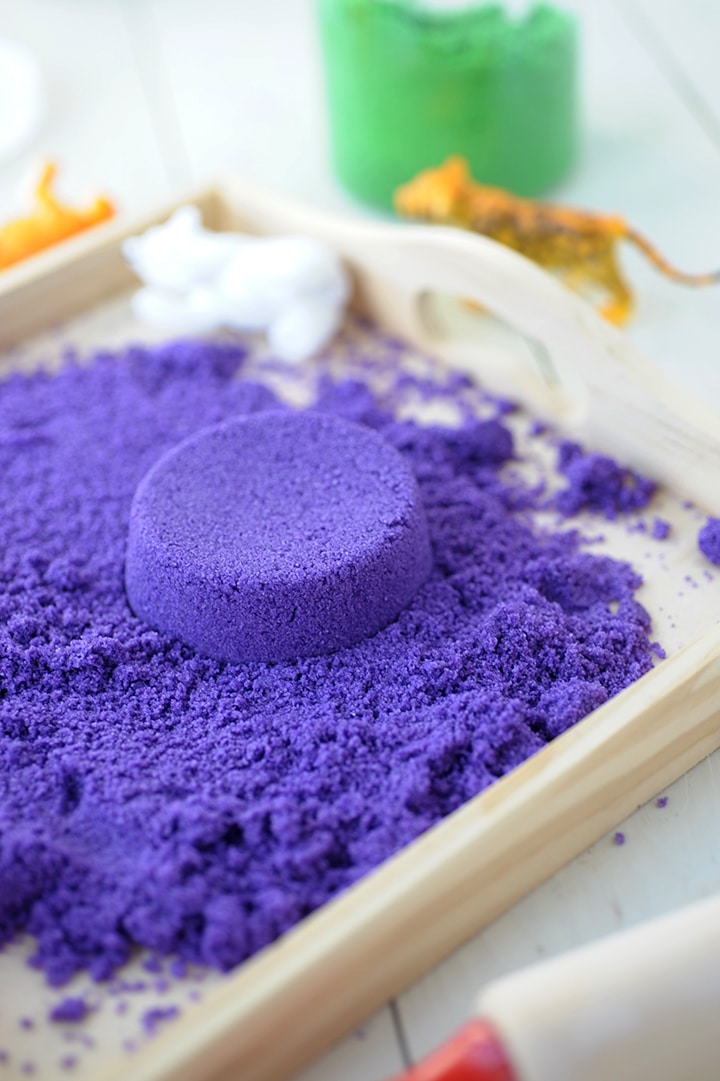 This month’s “Supply of the Month” series gave us colored sand to work with as our main craft inspiration. My youngest is pretty obsessed with kinetic sand these days so I thought this would be the perfect opportunity to make it at home. Kids of all ages love to play with this colorful sculpting sand!