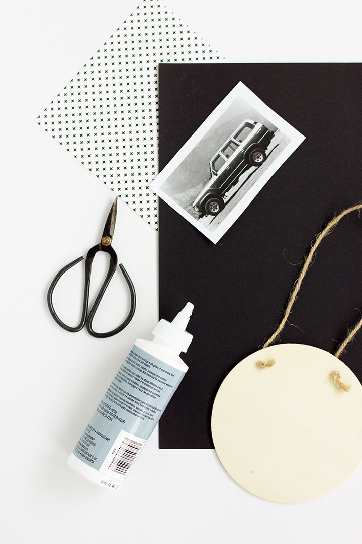 4. I wanted to add some interest to the plan wood ornament so I cut the circle ornament shape from a piece of black and white patterned paper. Glue onto the ornament.