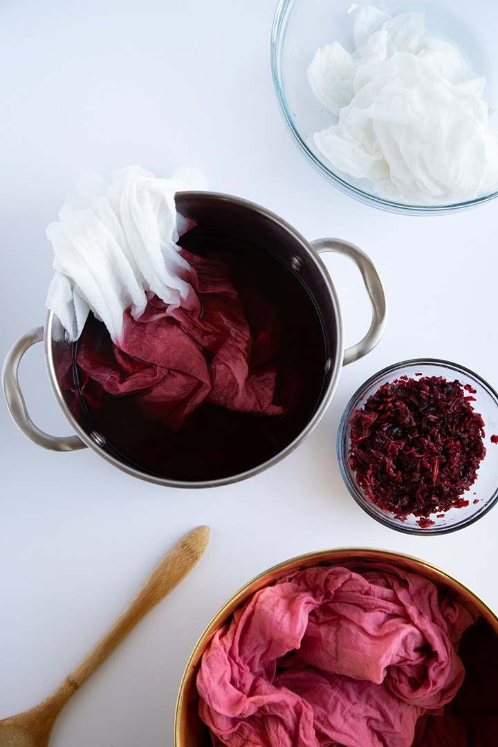 If you do not know – we are a bit obsessed with dyeing fabrics with natural dyes. We have done countless projects using (our very favorite) indigo dye. A few summers ago we dyed a huge tablecloth using the spice turmeric. I have wanted to try using tea or dried flowers as a dye for some time. I was at my local natural food store and grabbed a bunch of dried hibiscus flowers and could not wait to give them a try. We have partnered with Lysol® to talk about the new Lysol® Daily Cleanser.