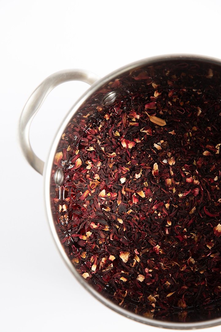 • In another pot, add the hibiscus flower (about one and half cups) to 10 cups water. Bring to a boil for about 30 minutes. Then bring to a low simmer.