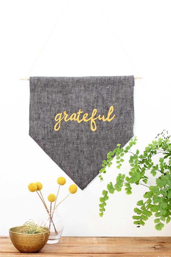 Thanksgiving is a time to celebrate family and to practice gratitude. Our latest DIY for minted is a favorite of mine. I made a simple no-sew banner with the word “grateful”.  It is a pleasant reminder to practice gratitude during Thanksgiving. Head over to minted’s blog, Julep for the full tutorial for the DIY No-Sew Thanksgiving Banner.  I used a favorite crafting adhesive, fusible hemming tape to “sew” the edges of the banner.