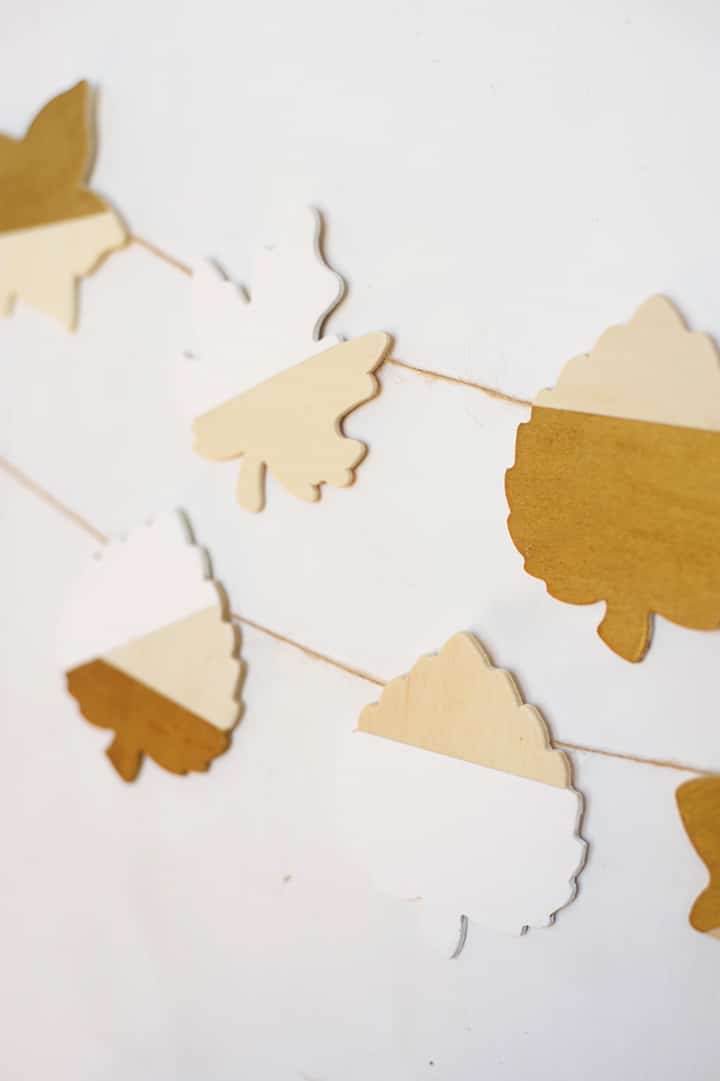 We were inspired by simple Scandinavian design when we created this one of a kind DIY Painted Wood Leaf Garland. White and gold paint look so beautiful on light raw wood. Hand this garland on the wall behind your dining room table for Thanksgiving or over a table in your entryway. It looks beautiful with pops of color like orange, yellow and red. We painted a few extra wooden leaves to use as place cards too for our Thanksgiving meal!