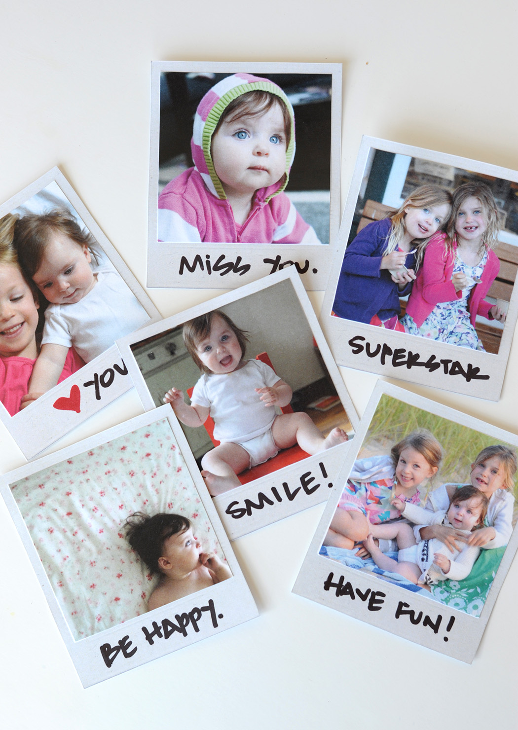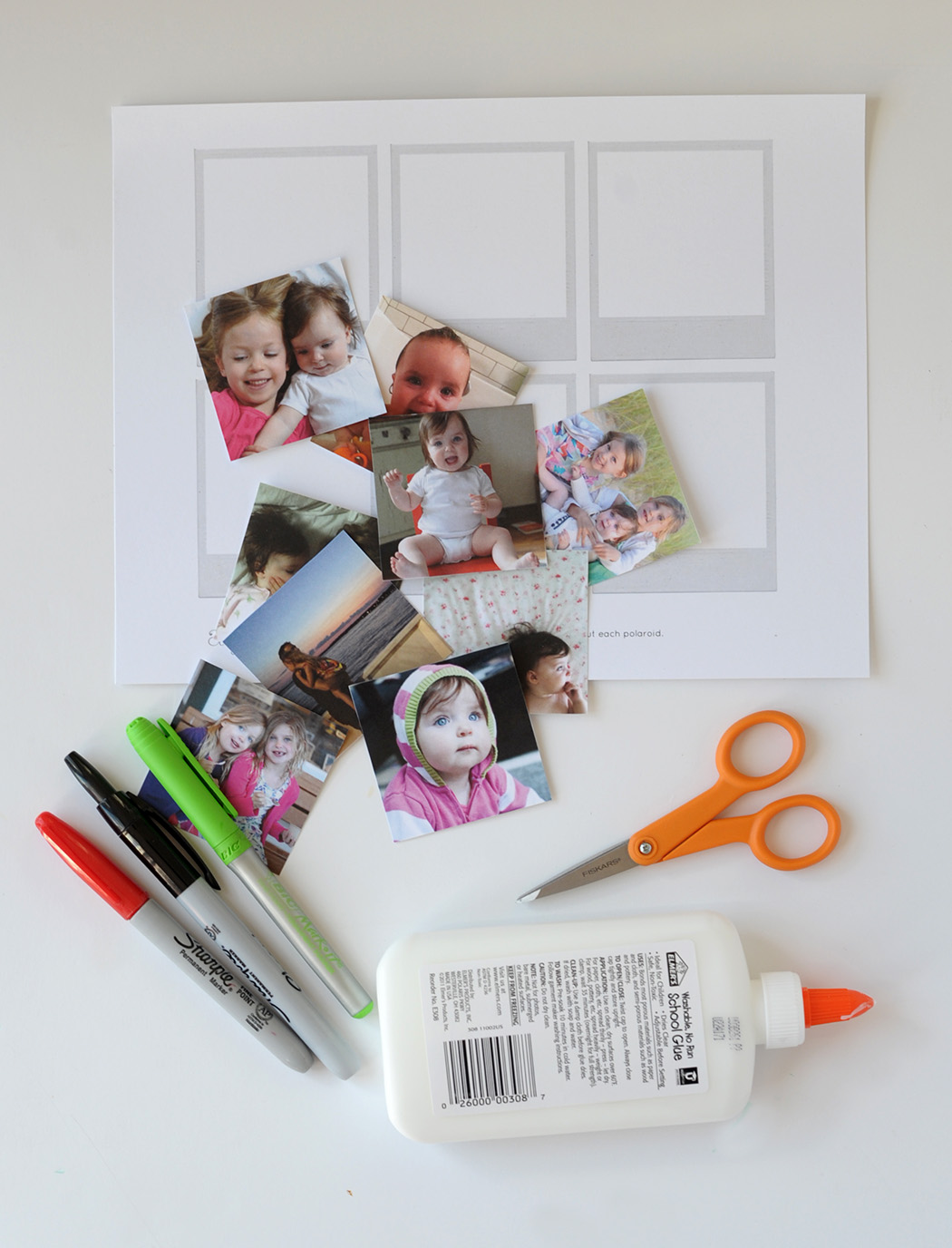 Okay, this really couldn’t get any easier. Print out the free printable on white copy paper or white card stock and cut out each polaroid. Then print out your pictures at 2.5 x 2.5 inches on white paper. You can use Word, free Photoshop Express or Pic Monkey to size them. Then glue them onto the polaroid frame and write your sweet message to your little one.