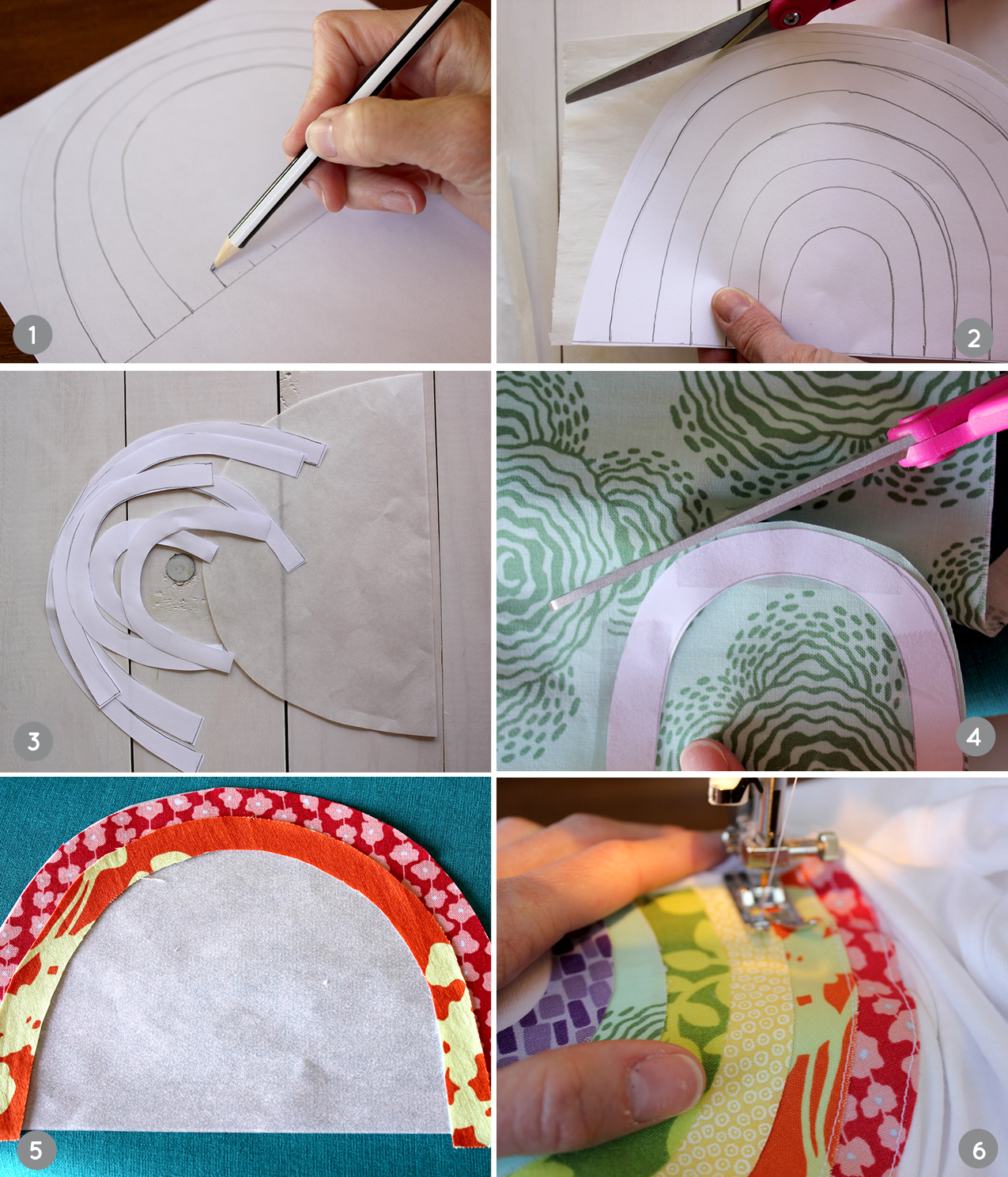 Step 4: Match up appropriate colors to each rainbow section. Using scissors or a rotary cutter, cut fabric to match each section.