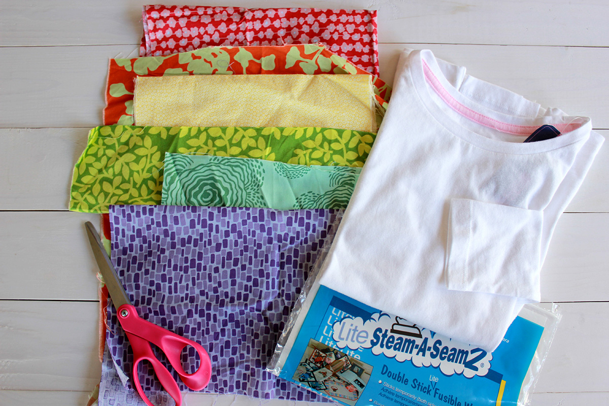 supplies rainbow applique shirt form aliceandlois.comSupplies: Scrap fabric, plain white t-shirt, double stick fusible webbing