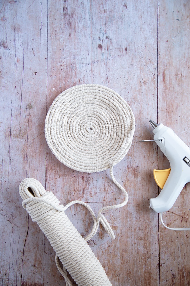 - Once you glue enough of the rope in the circle pattern and it is a bit larger than the bowl, start layering the rope on top of itself (see video). Continue the wrapping and glueing until your desired height.