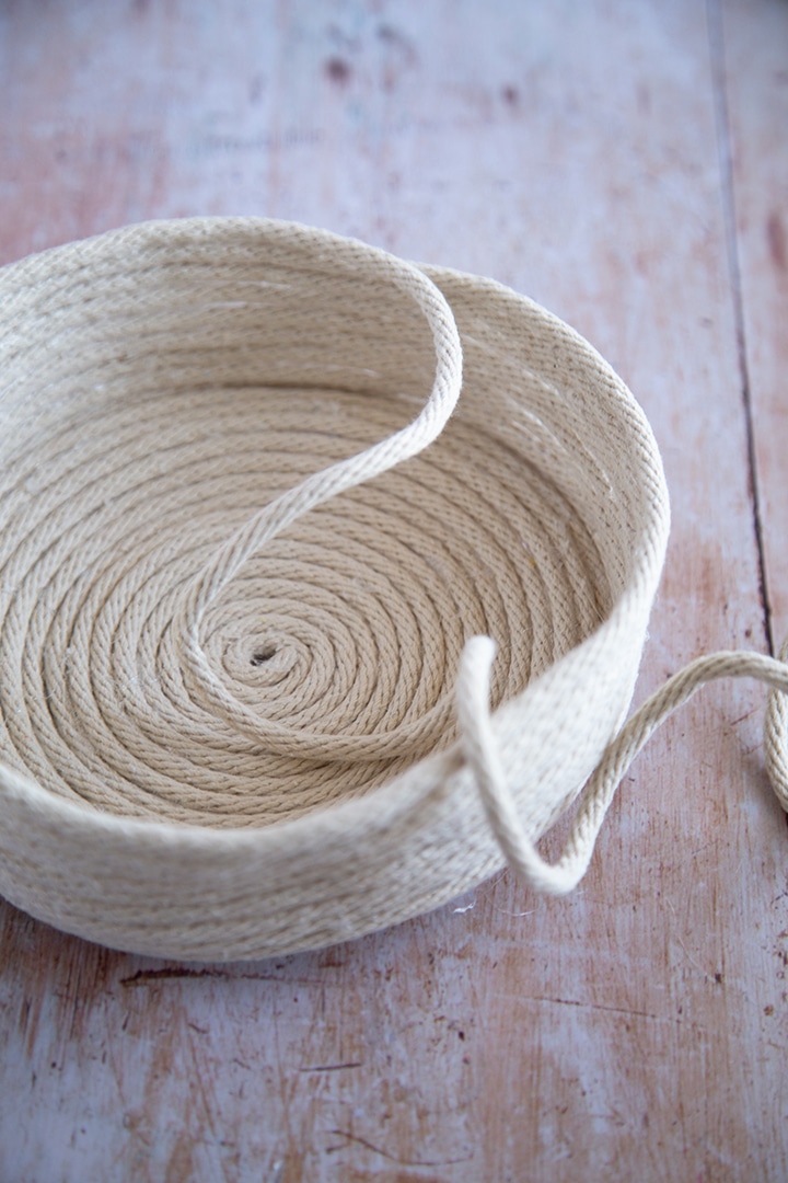 - Find a bowl that is the same dimension of your desired basket. Then start glueing the rope together using hot glue gun. Be careful as the glue is hot. Wrap the rope, glue. Wrap the rope, glue.