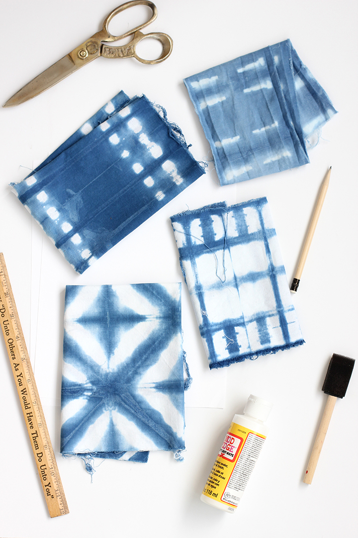 Supplies: shibori indigo dyed fabric scraps | mod podge | foam brush | scissors | card stock paper | ruler | suede cord | hole punch