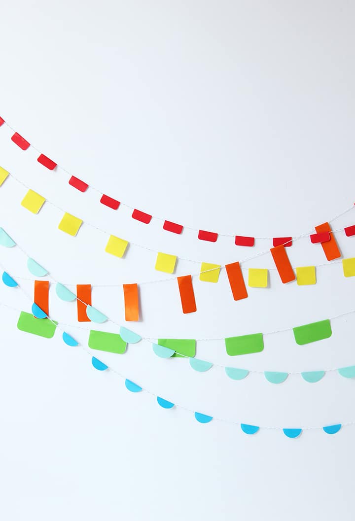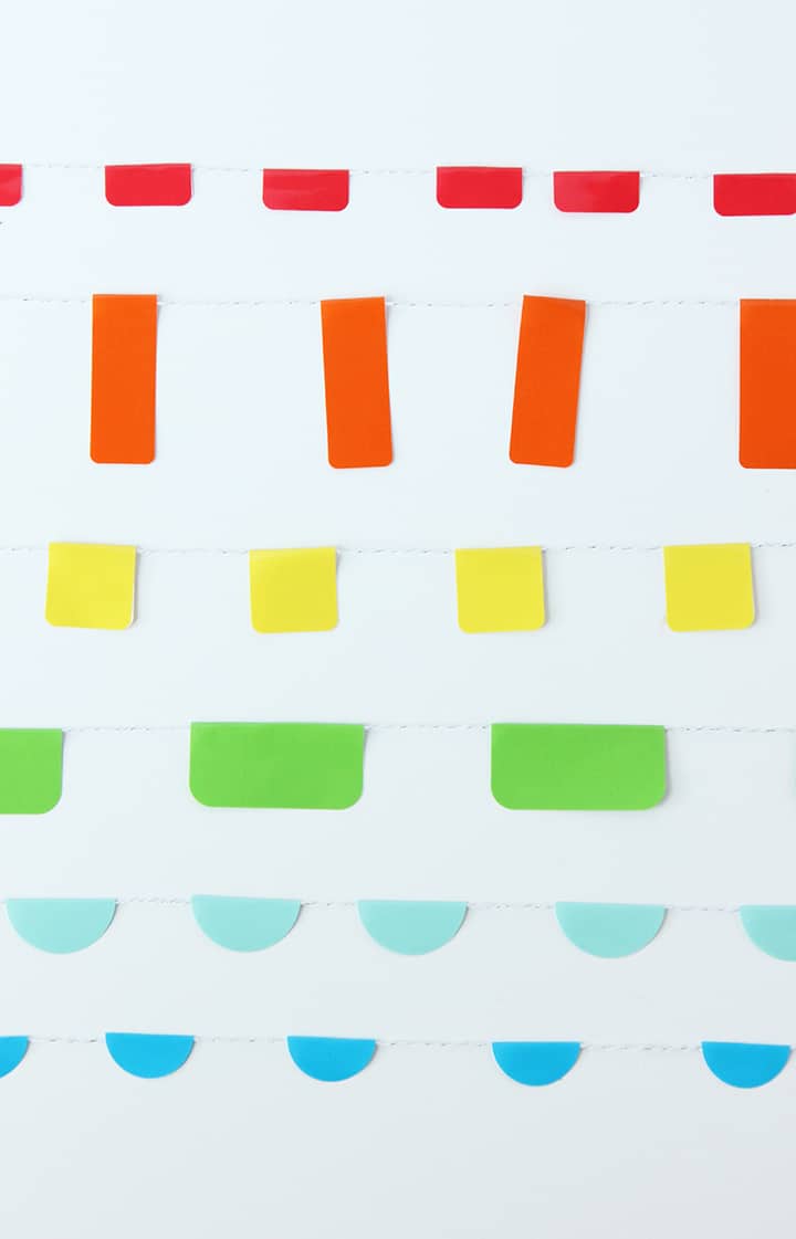 Everyday there can be a reason (any reason) for a little celebration. Whether it’s a completion of a big project, an A on a spelling test, a big win at the ball game – you can add a little fun and flair to the house with our simple DIY Sticker Roll Garland. We love how simple this garland is to make. We used the sticker roll pack from Oriental Trading. The stickers comes in different shapes and colors. Red, orange, yellow, green and light blue and aqua. And the best part, the pack is only $10. You can make so much garland with this sticker roll pack!