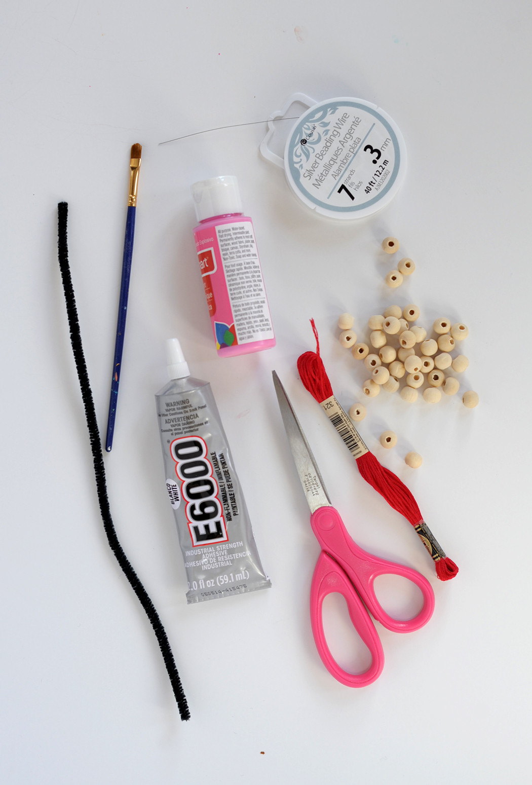 Supplies: pipe cleaners / E6000 glue / scissors / acrylic craft paint / 3/8 in. round wooden beads / beading wire / embroidery thread