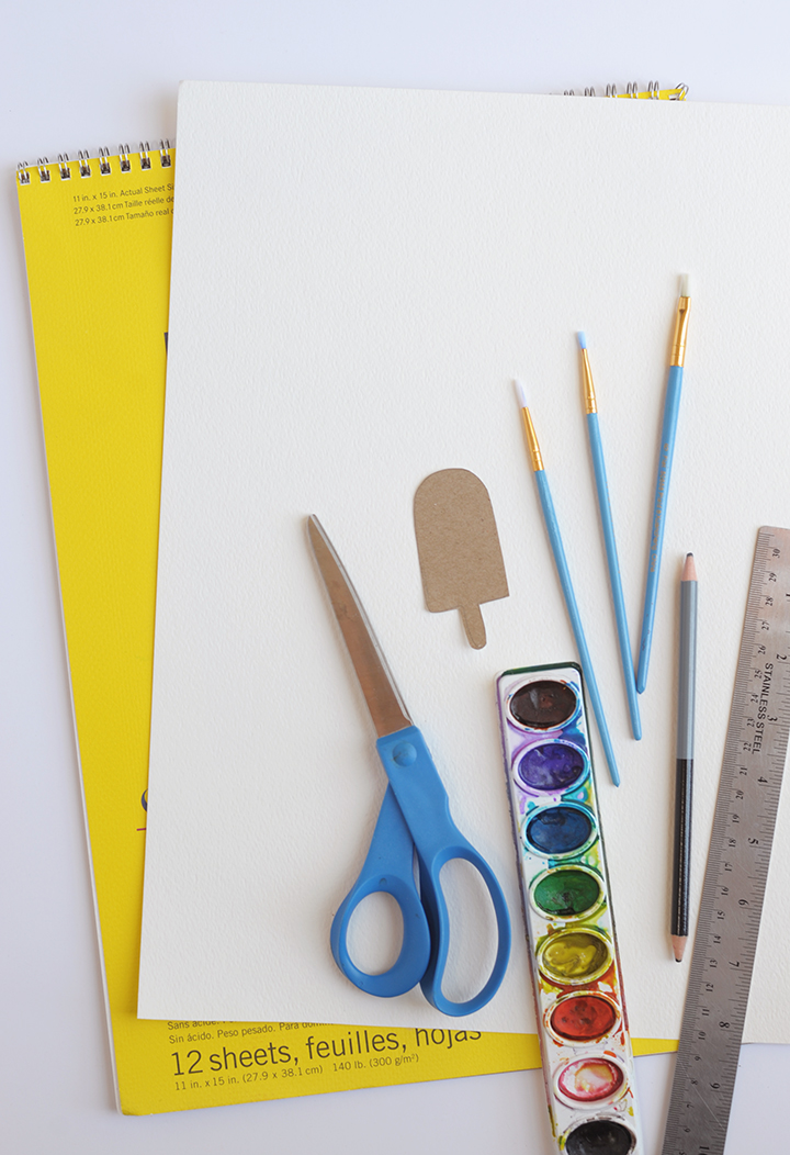 Supplies: watercolor paper, watercolors, paintbrushes, pencil, ruler, scissors, popsicle template