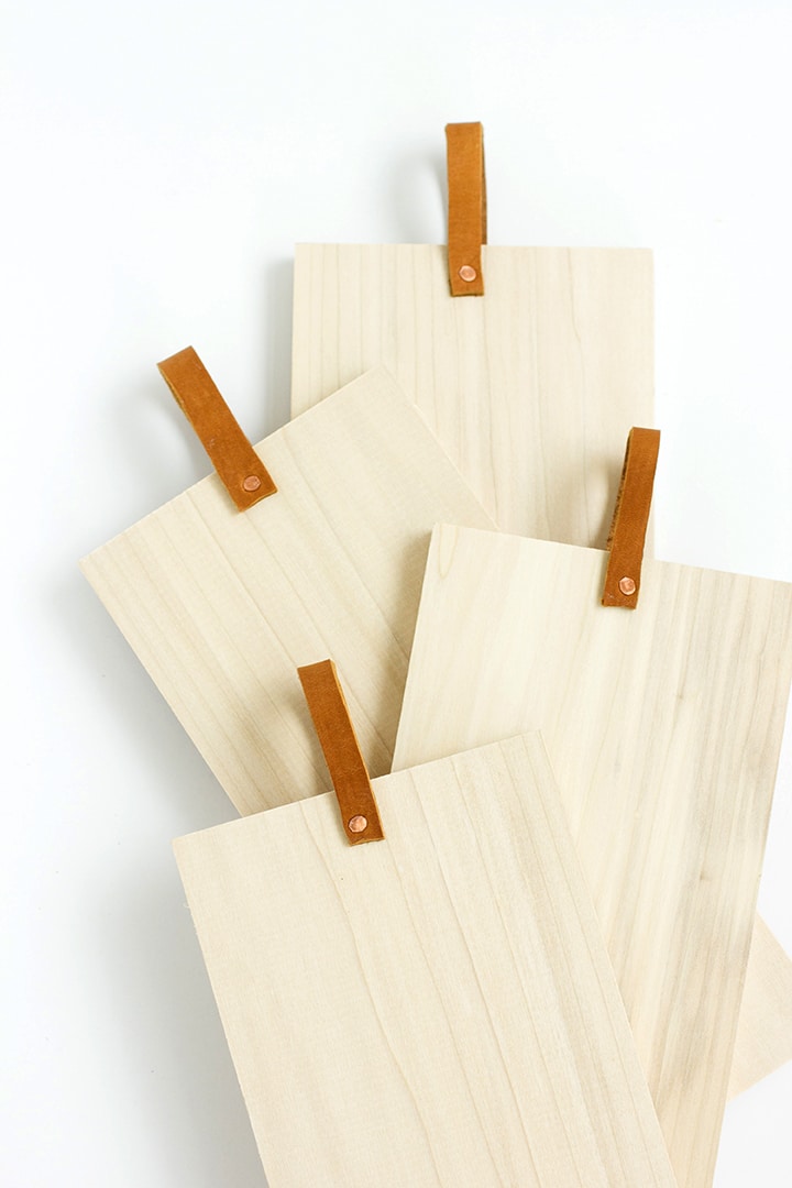 2. Cut strips of leather, quarter inch thick and 6 inches long. Nail the copper cut tack through the leather onto the front of board. Do the same on the back. The leather is for decoration but could be used to hang the boards as well.