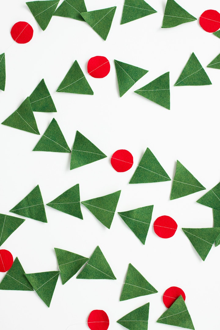 Now to add another special element to this thoughtful gift – we made a simple DIY Modern Holiday Garland. This garland is so easy to make and can be used as the ribbon on the gift wrap, and even better, you can hang it up on the wall as well! We wanted to mimic the modern triangle vibe of the blanket we made, so we used green triangle shapes and threw in some red circles to mimic holly.