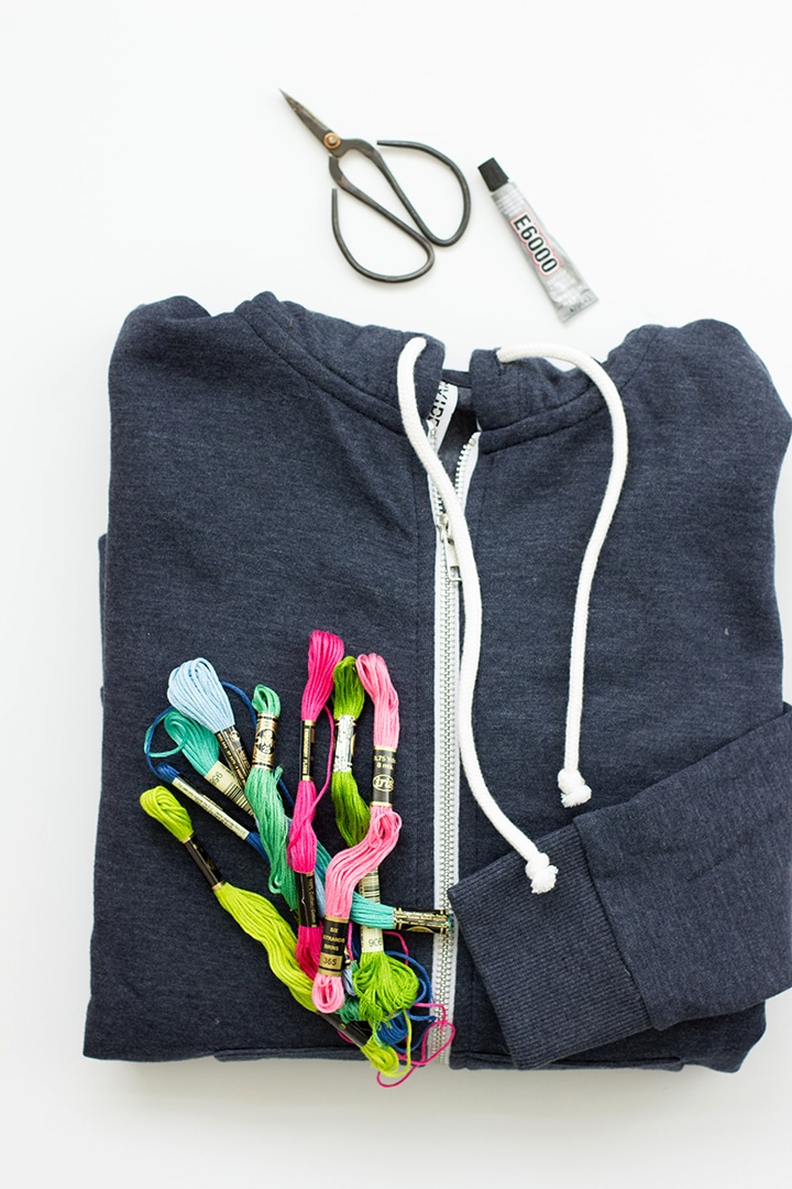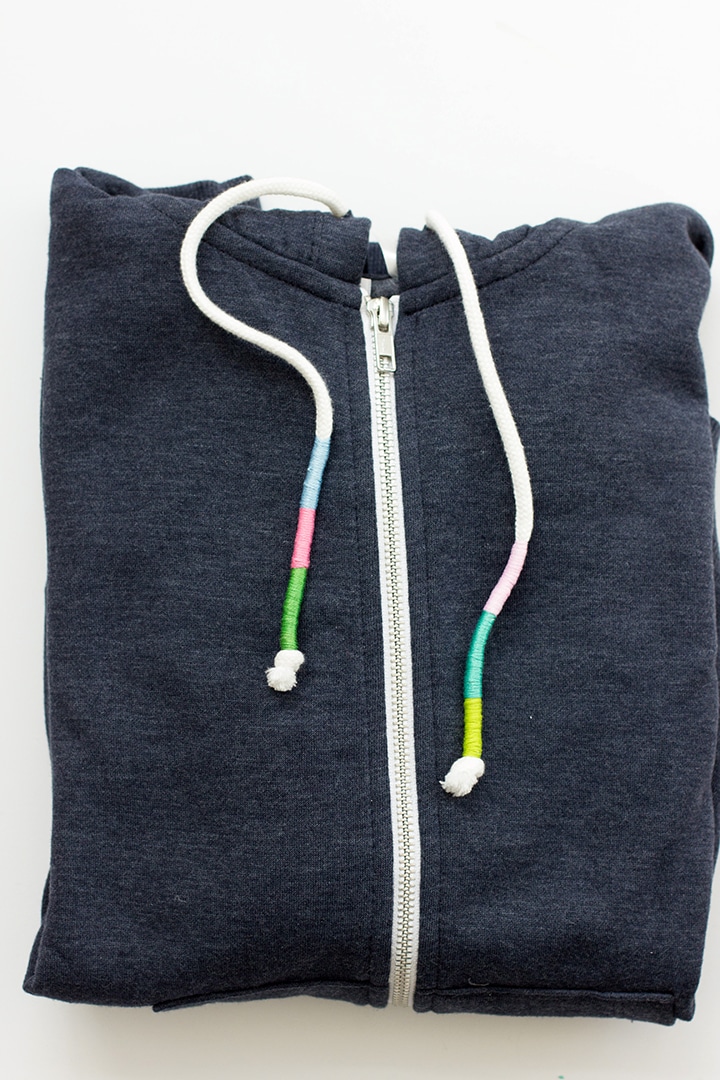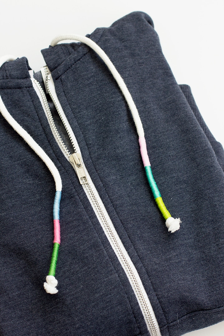 If you are anything like me, I live (I really mean it) in zip-up hooded sweatshirts. I have a few favorites but needed to add a new one into the rotation. I had picked up this weathered blue zipped hoodie at H&M recently and wanted to add a little something special to add a personal touch. I had thought of adding an iron-on patch but was drawn to doing something with the hoodie cords. I knew adding some color was the key, so a DIY Wrapped Cord Sweatshirt was it!
