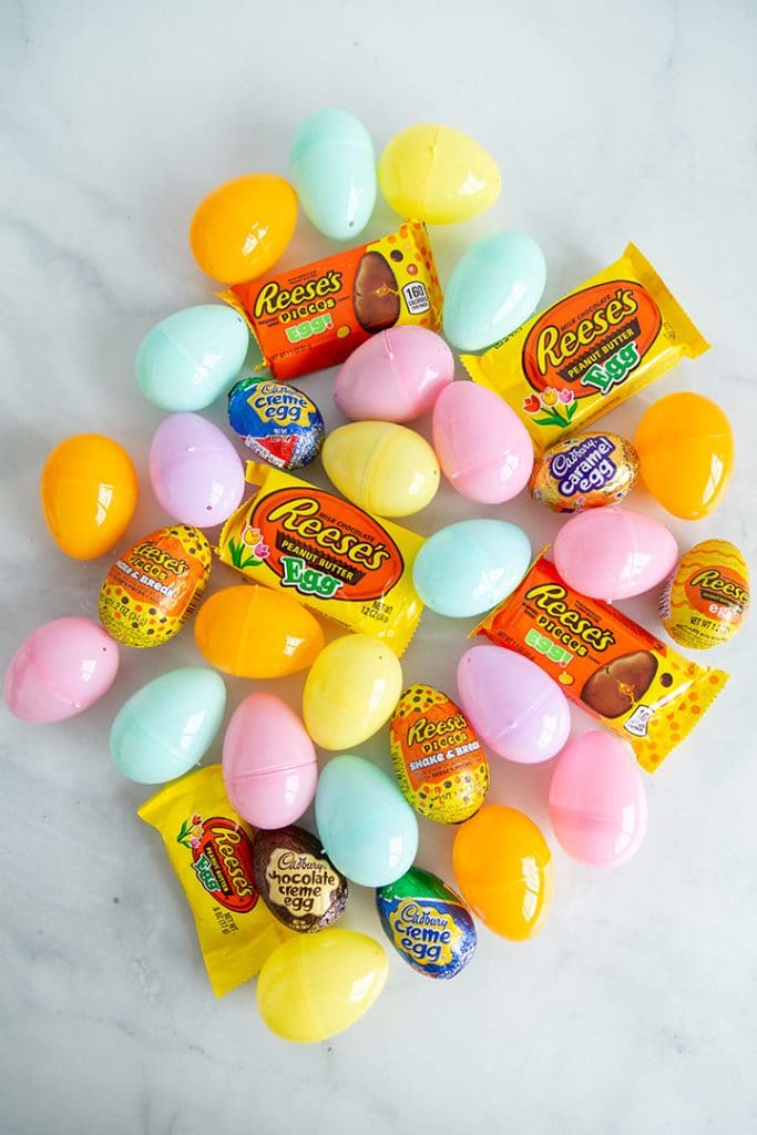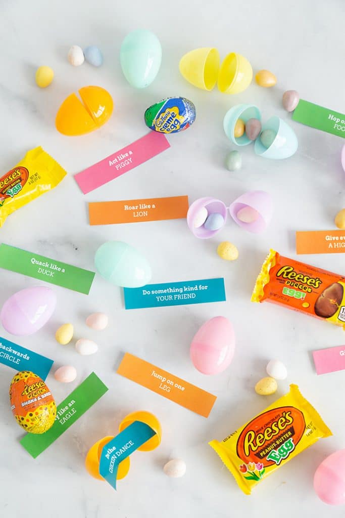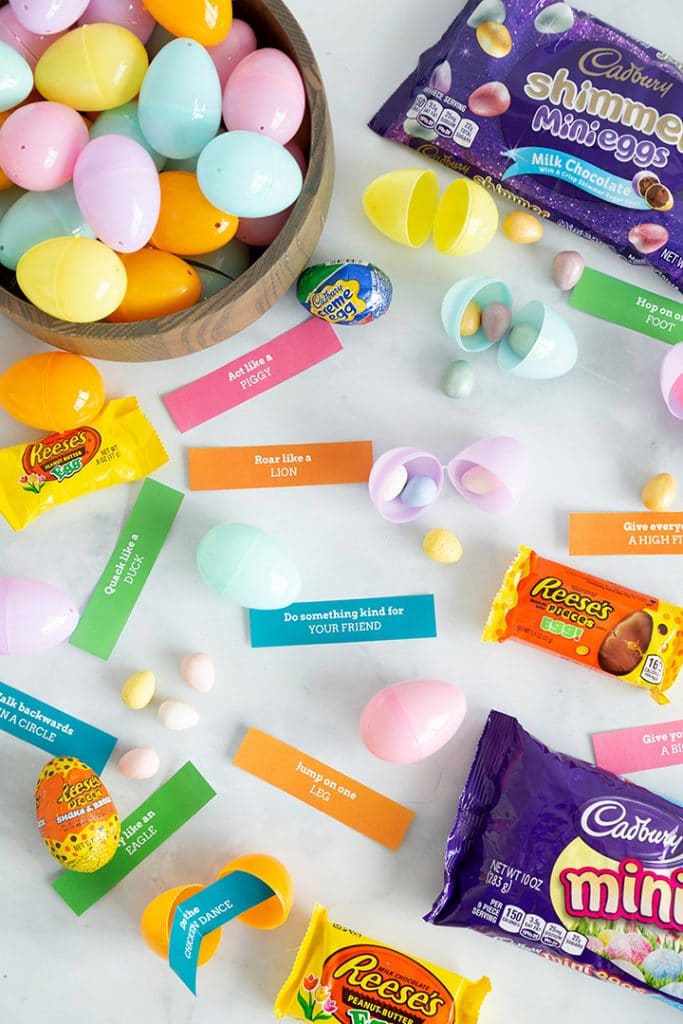 Fill the eggs with the printables and candy. Some of our favorite candies to fill the eggs with are: