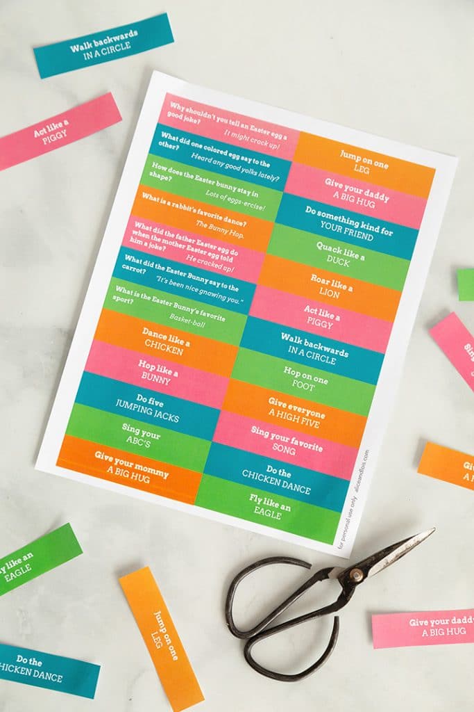 Turning the basic Easter egg hunt into a more interactive game has been so much fun for our kids. We designed an Easter Egg Hunt Free Printable Activity for you to use this Easter. The printable is filled with funny quick activities for the kids to do, like “Roar like a lion” or “Hop like a bunny.” We also included some Easter-themed kid jokes like, “What is a rabbit’s favorite dance? The bunny hop!” And this year we wanted to add some extra kindness to the Easter egg hunt with some simple little ways to share the love, like “Give your daddy a hug or give everyone a high five!”