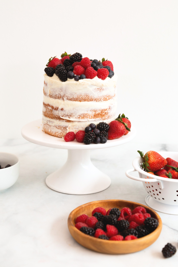 Learn how to make this super Easy 4th of July layer cake recipe! We use boxed cake mix, homemade frosting and lots of fresh berries to make this patriotic red, white and blue cake to celebrate the Fourth of July! An easy summer dessert recipe that the entire family will enjoy.