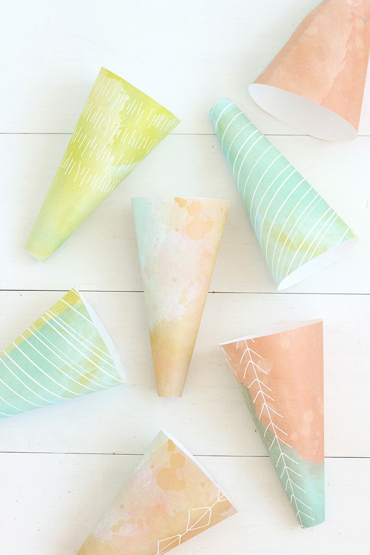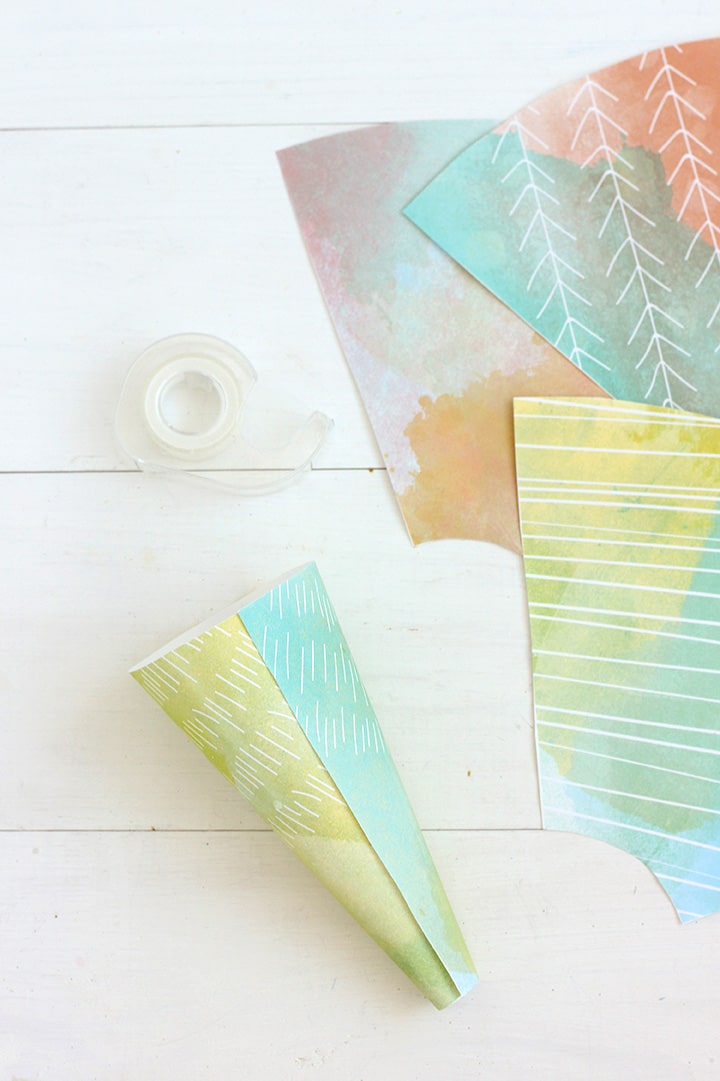Simply print the files and cut out the pattern. Use double-sided tape for wrapp ing the paper together to make a cone shape.