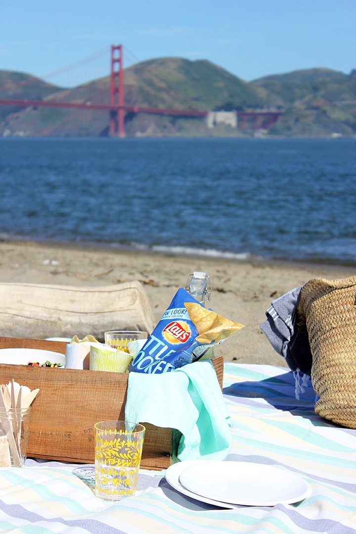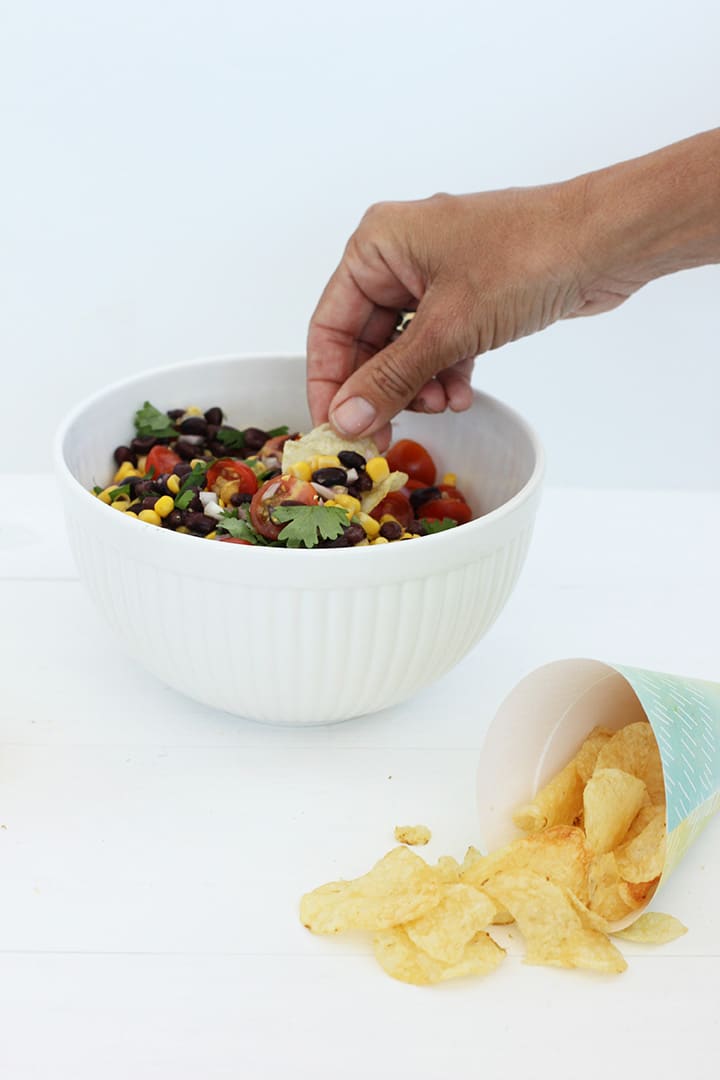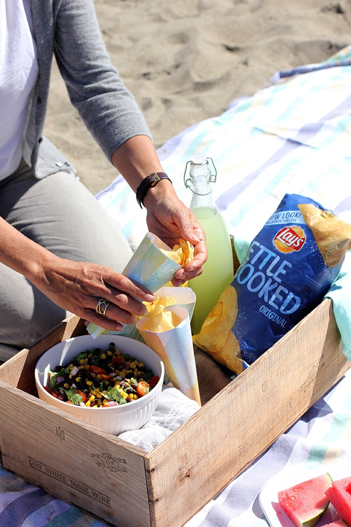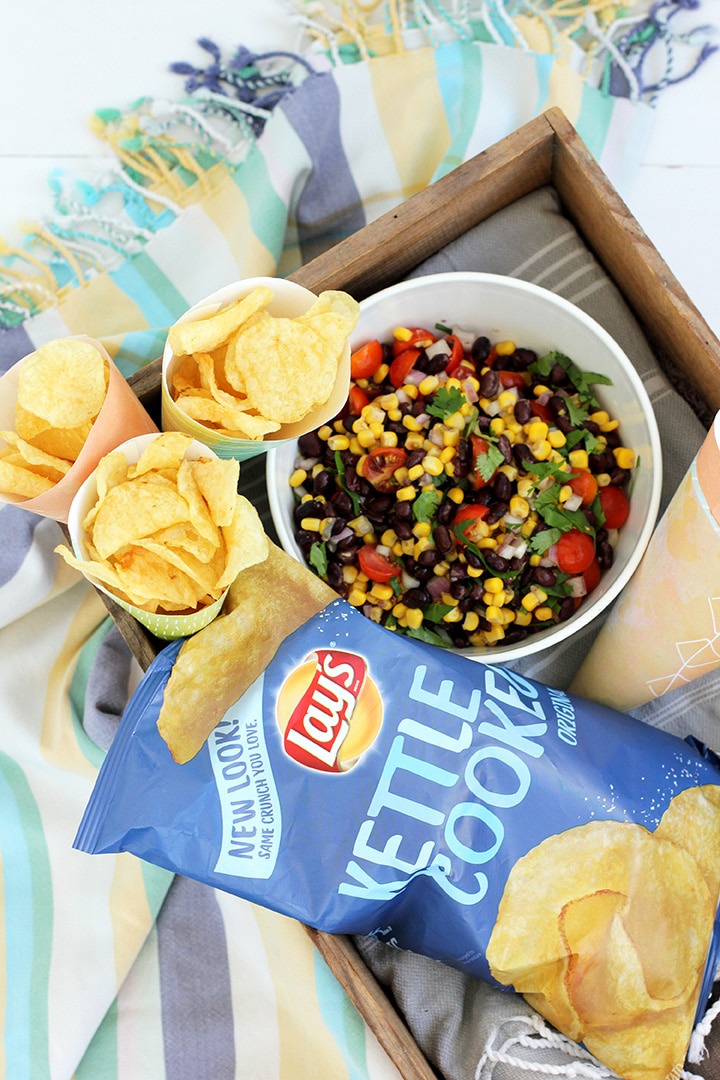 Today we are delighted to partner with Frito-Lay to share a few ideas on how to make a spontaneous beach picnic SIMPLE! Get ready to say yes to summer activities more easily with our easy black bean and corn salad recipe that takes minutes to throw together. And you want to know what we love about this “salad?” You use Lays Kettle Cooked Potato Chips to scoop it up to eat!