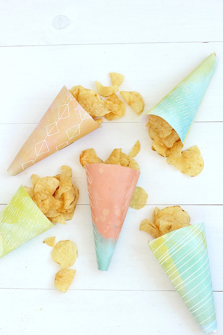 Beach picnics are so much fun – but sometimes the sand can get all over. So we designed a simple paper chip “cone” to let your guests have a holder for their chips. You could use these for popcorn too! It makes snacking at the beach so much easier.