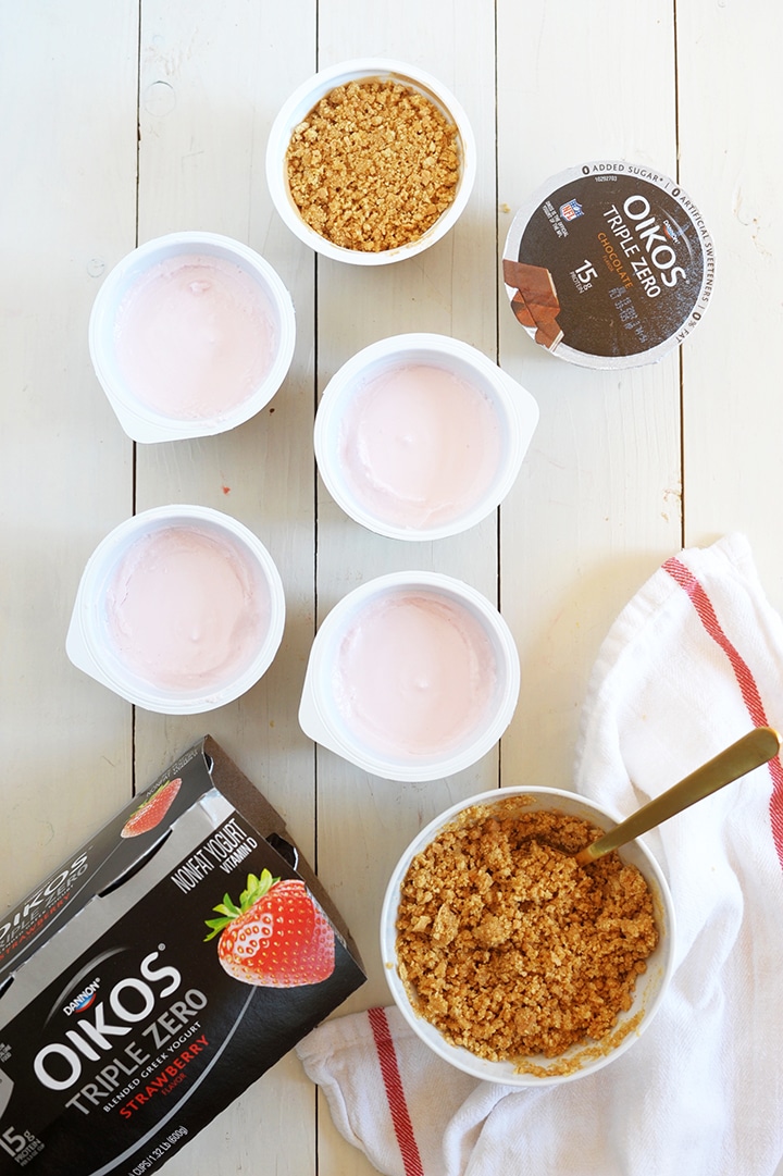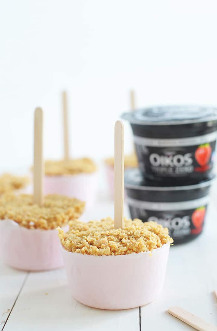 We teamed up with Dannon to create these delicious and protein-packed cheesecake yogurt pops using their Dannon® Oiokos® Triple Zero strawberry yogurt, for a classic strawberry cheesecake popsicle. And for all you chocolate fans, we love their Oikos Triple Zero Mayan Chocolate blended greek yogurt too. Chocolate cheesecake anyone?