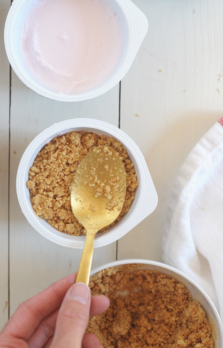 4. Spoon graham cracker crust to the top of yogurt and press gently with spoon.