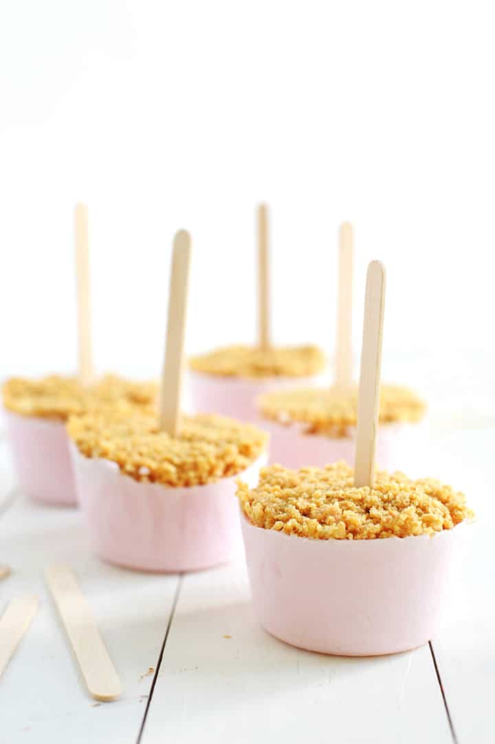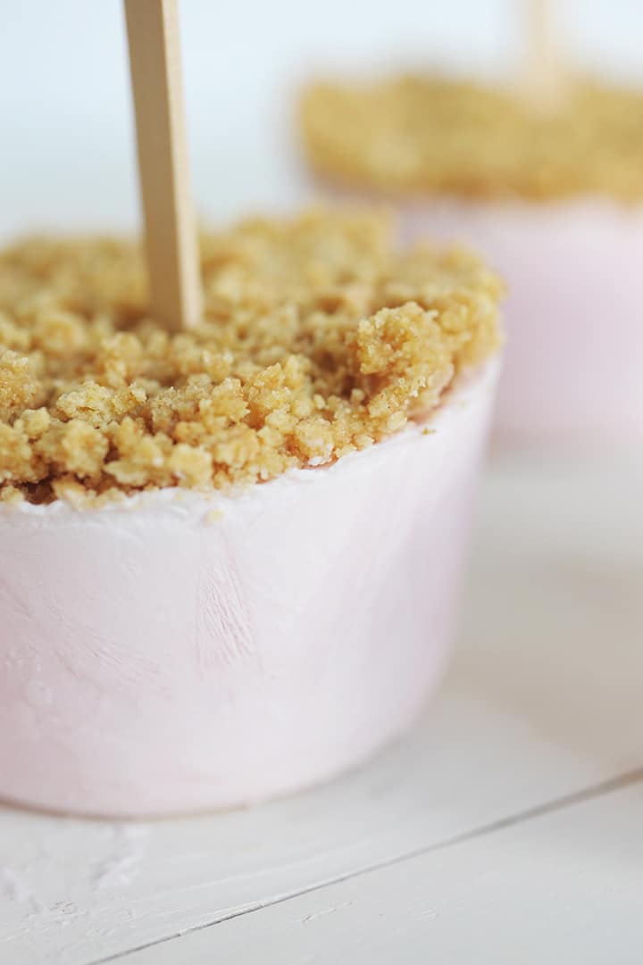 5. Insert a popsicle stick into center of crust. Be sure not to press all the way down, you don’t want your stick coming out of the top of the popsicle.