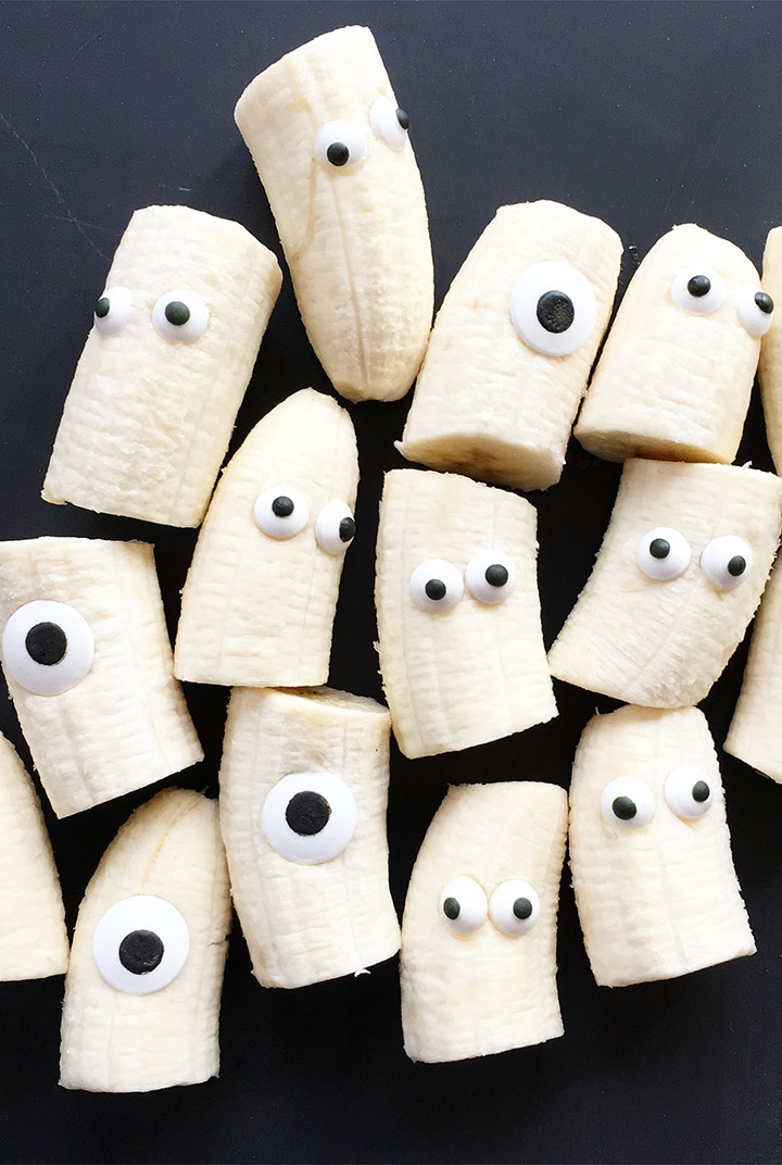 Directions: Just peel the bananas, cut in thirds and place candy eyes onto bananas.
